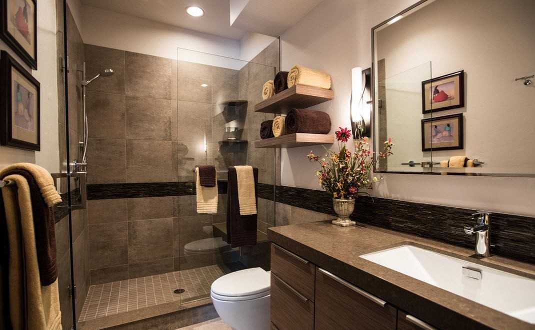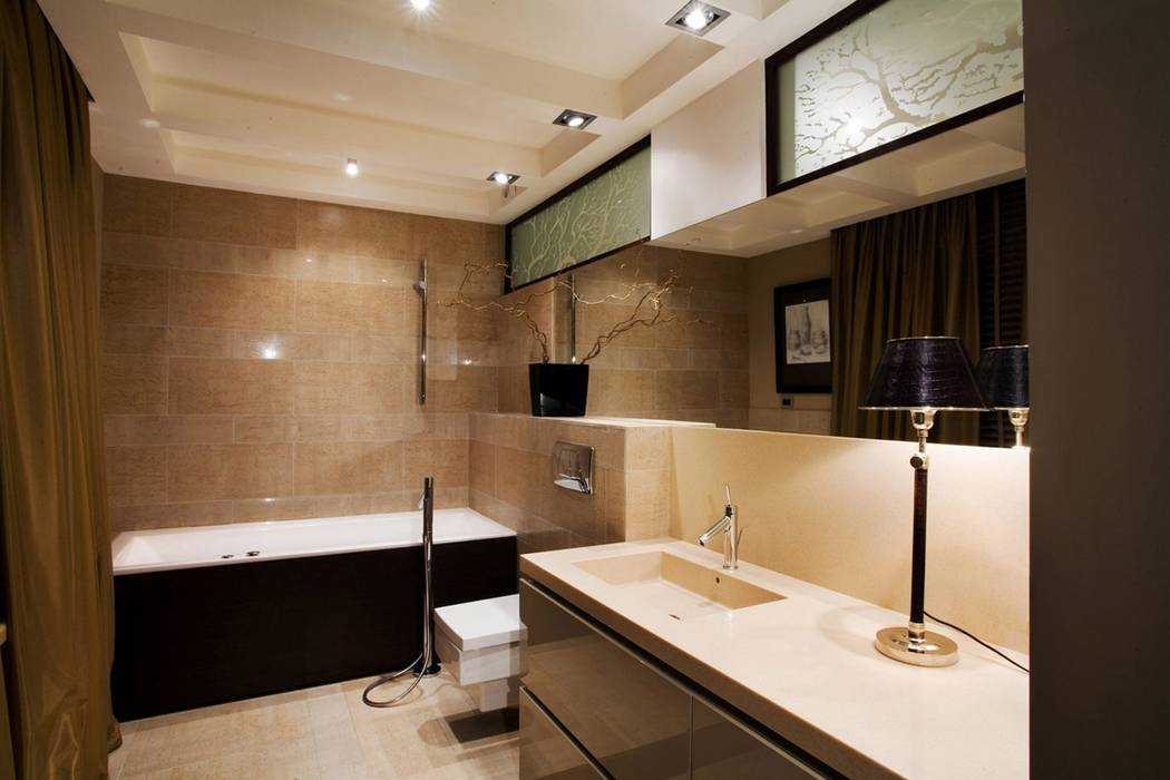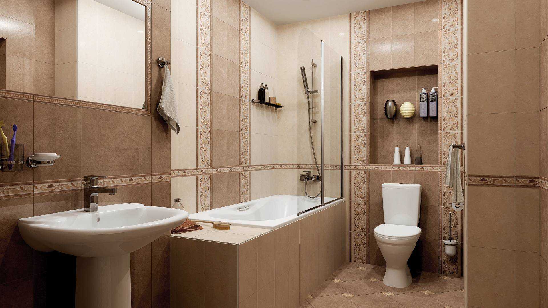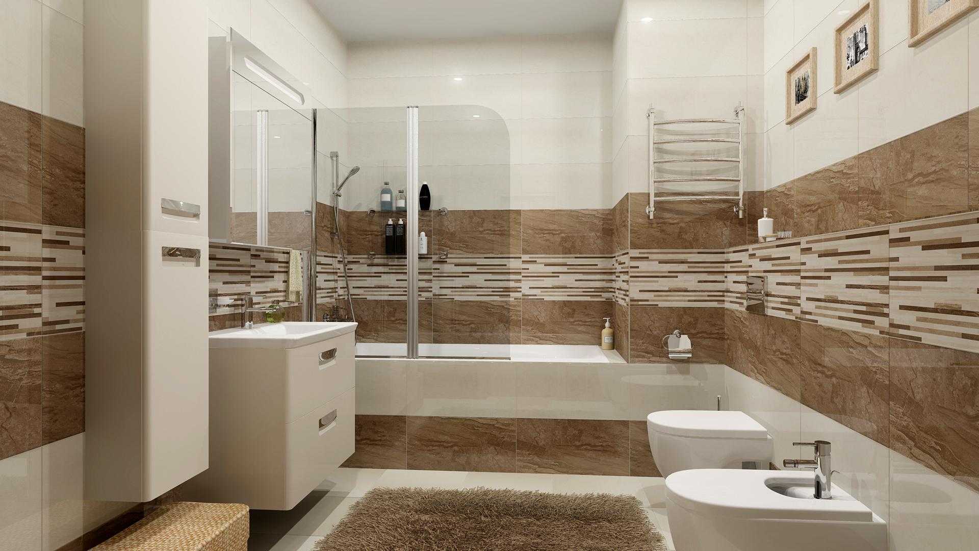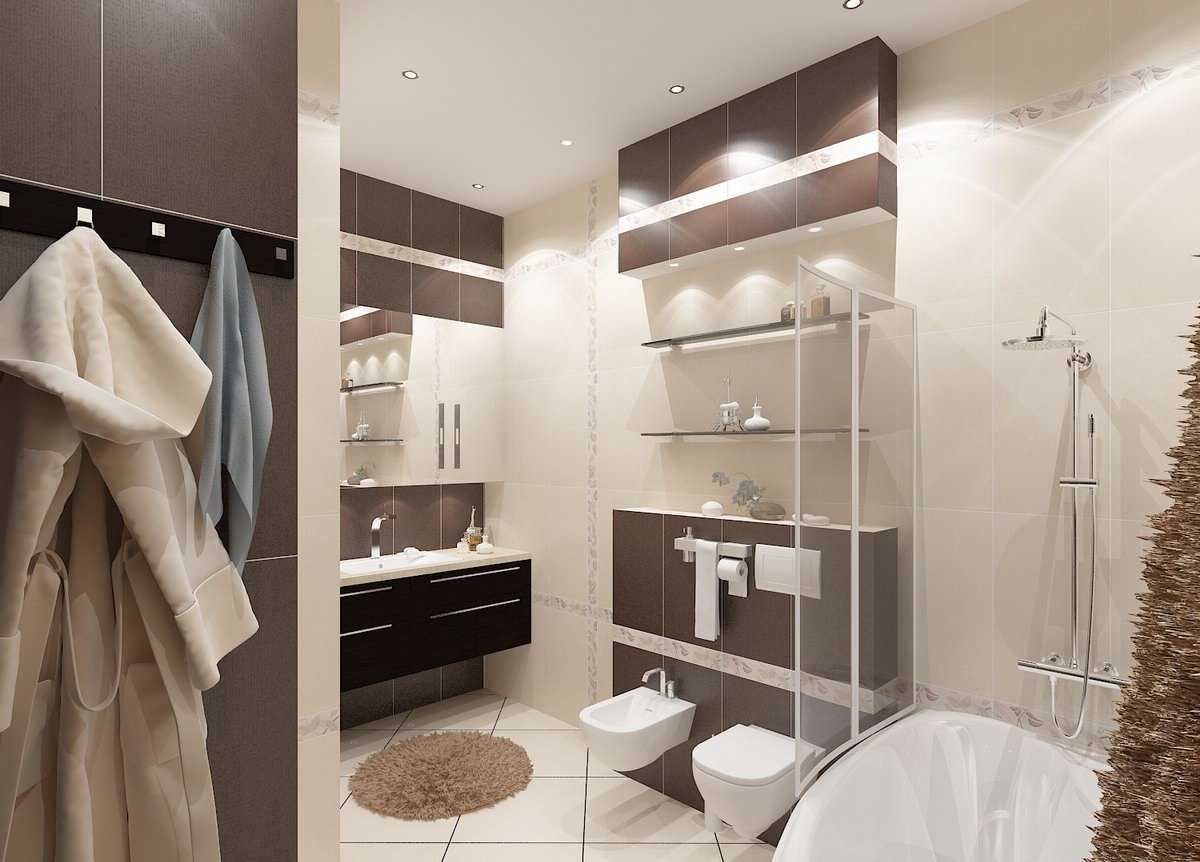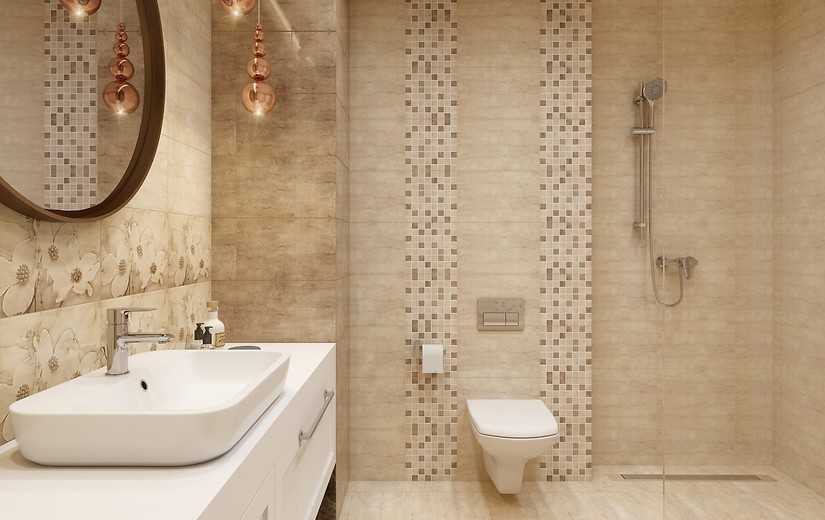 Кафель оттенка темный беж в дизайне стен также можно использовать. Он может иметь характерный серый отлив или приближаться к тону капучино с примесями розового и коньячного.