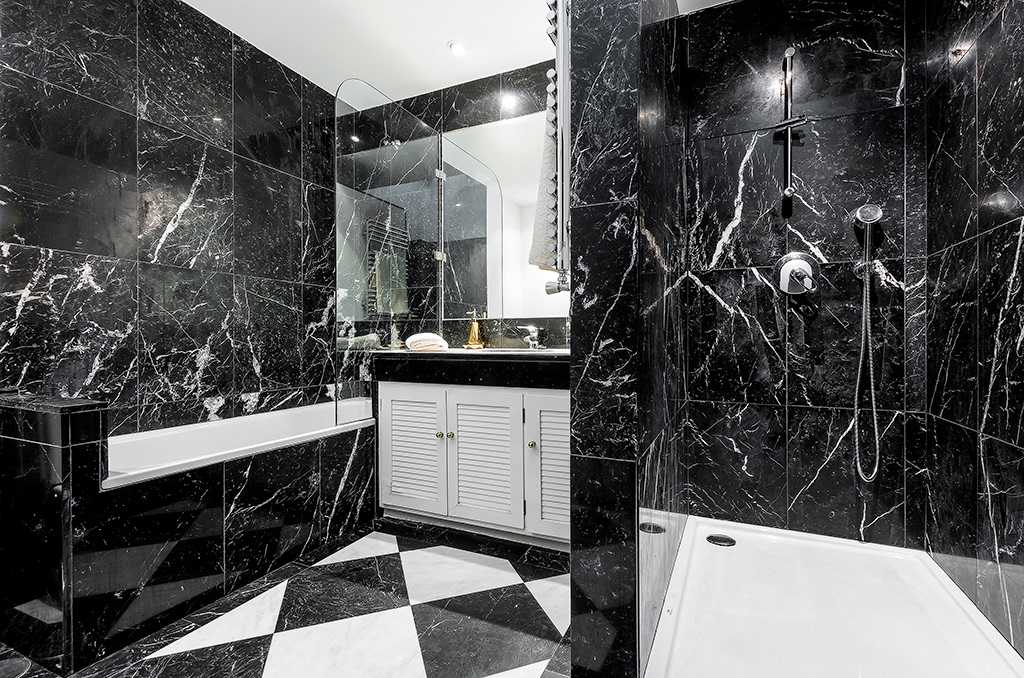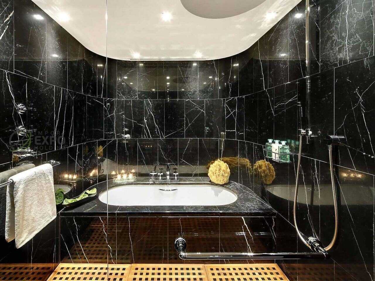 Санузел под мрамор в черных тонах уместно оформлять, если помещение просторное. Хотя этот колер не самый практичный, на таких поверхностях сразу заметны капли воды.