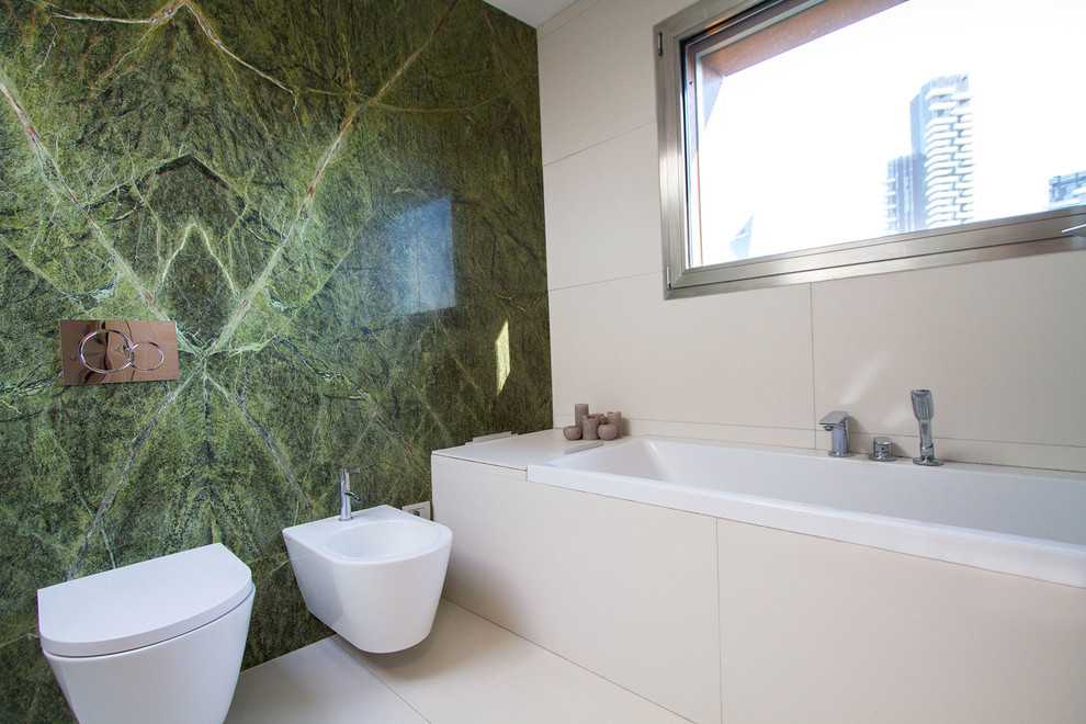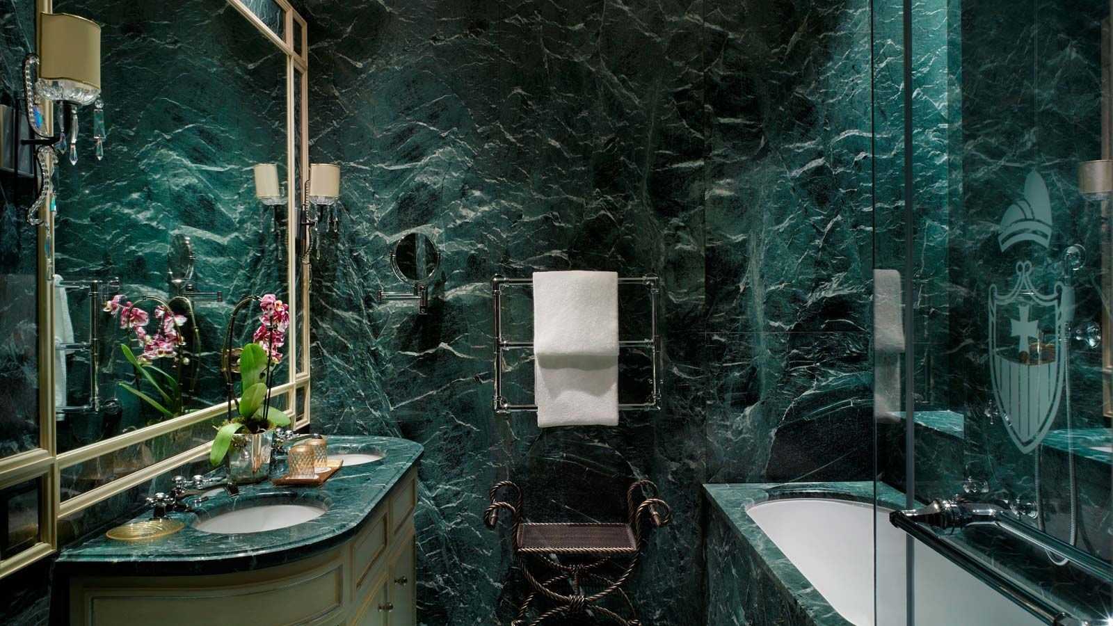 Модерн и арт-деко тоже отлично сочетаются с мраморной ванной комнатой. Аристократичность и природное происхождение материала вполне соответствуют этим направлениям.