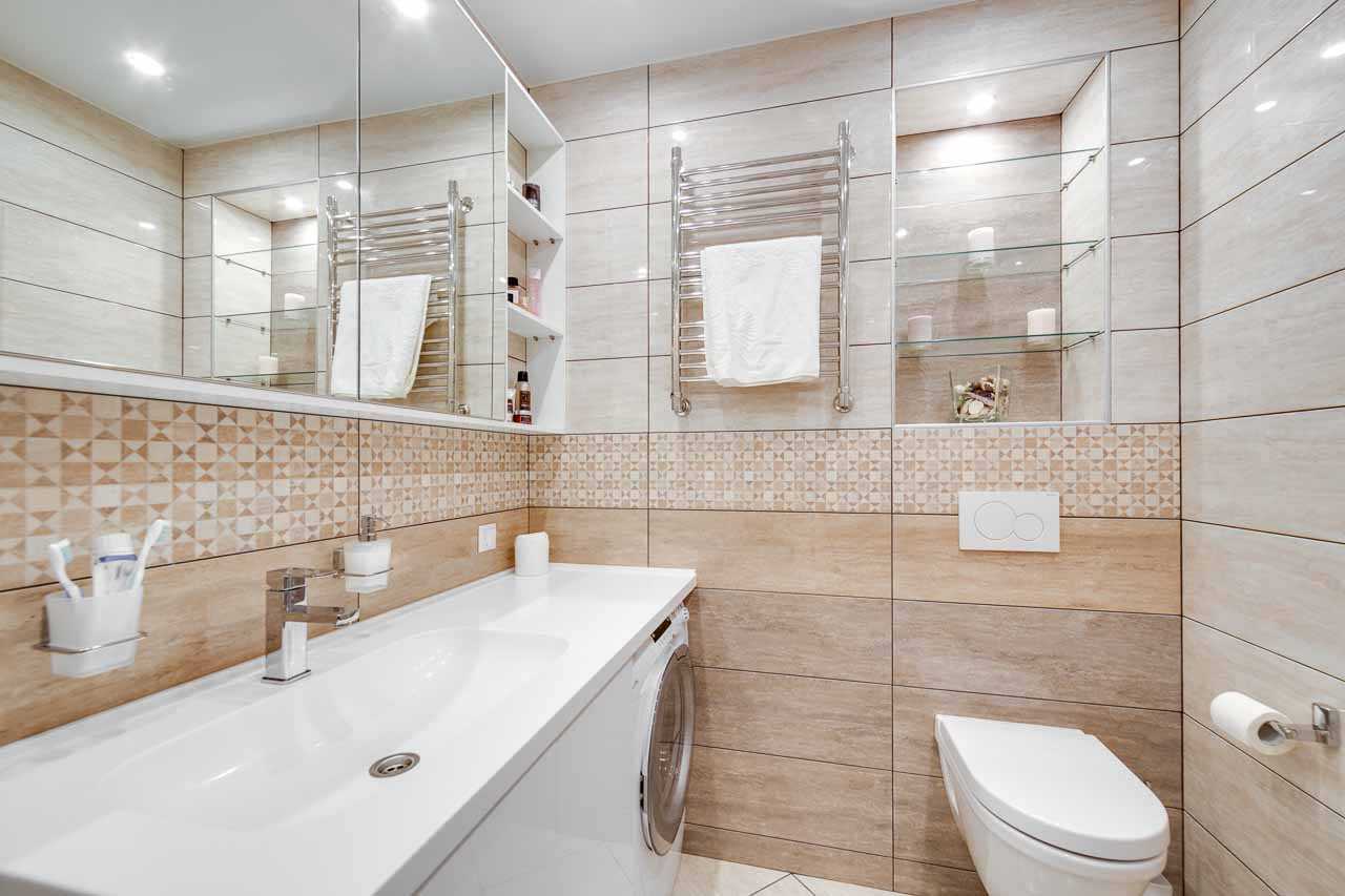 Бежевый кафель отличается формами, размерами и другими параметрами. Крупногабаритную плитку чаще применяют в минималистичных интерьерах.