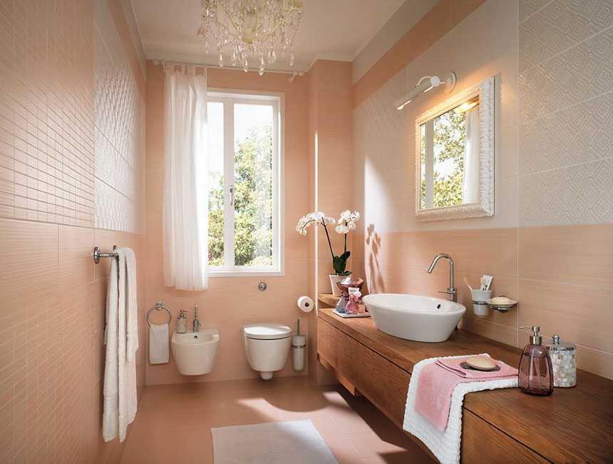 Из более теплых вариаций выделяется персиковый беж. Используйте плитку в блестящем исполнении с едва заметными отблесками и переливами.