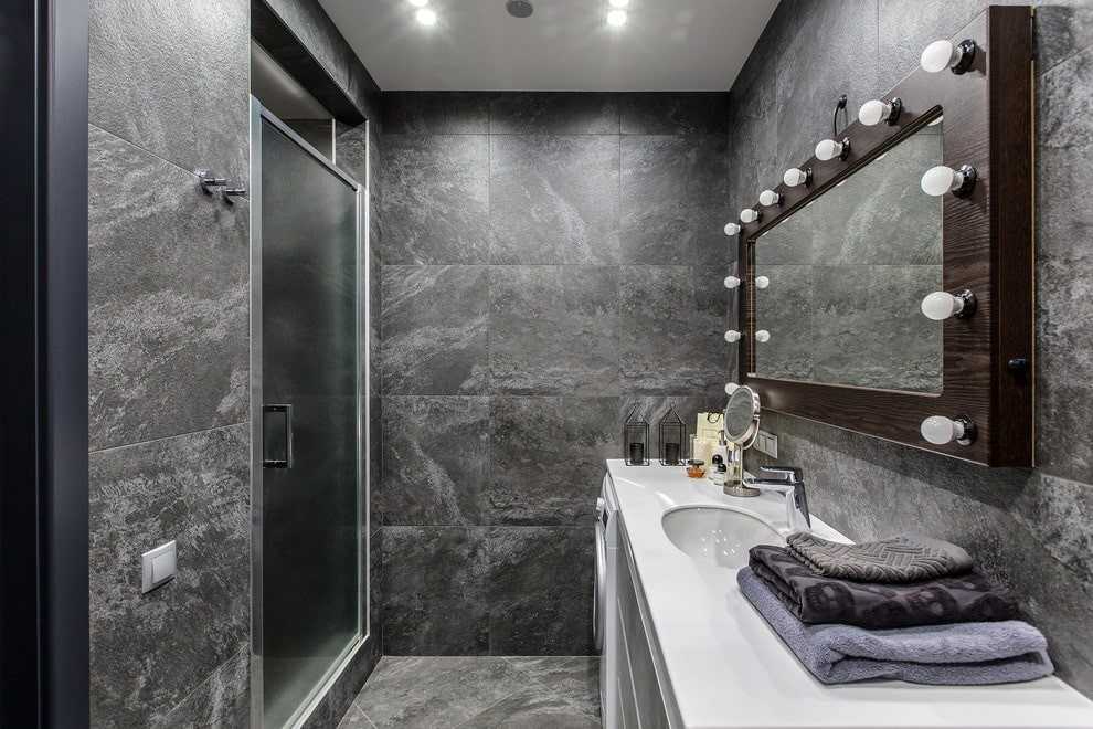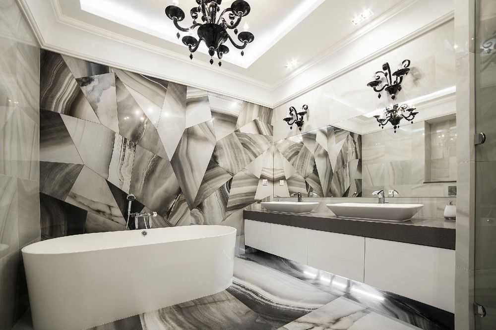 - Современный. Если в первых двух интерьерах допустимо дополнить и без того роскошный камень богатым декором (например, фрезеровкой на столешнице), то здесь этого делать не стоит. Яркая фактура сама по себе выделяется в ванной комнате. Цвет — белый, серый, черный.