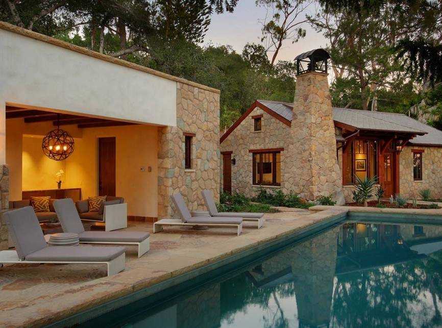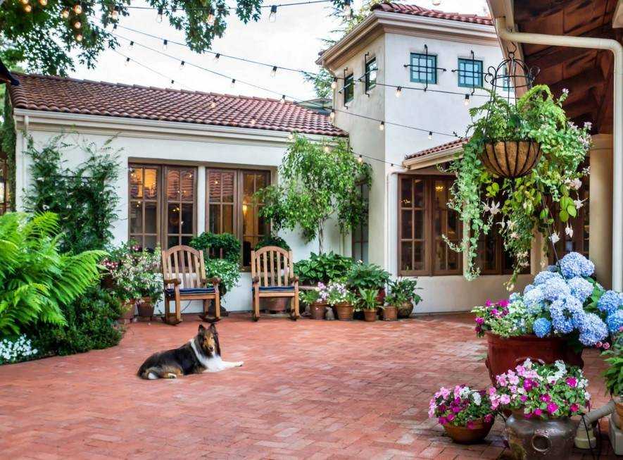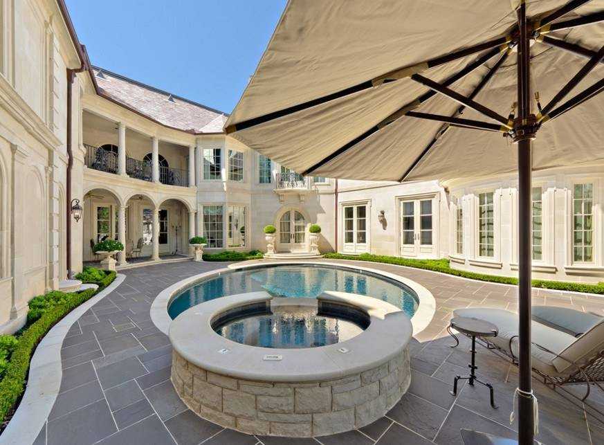 13. Внутренний двор в средиземноморском стиле в Остине, штат Техас, с изысканным каменным водоемом в качестве центрального элемента этого сказочного открытого пространства. Пышные сады окружают садовую мебель, создавая тихий оазис. (через Root Design Company)