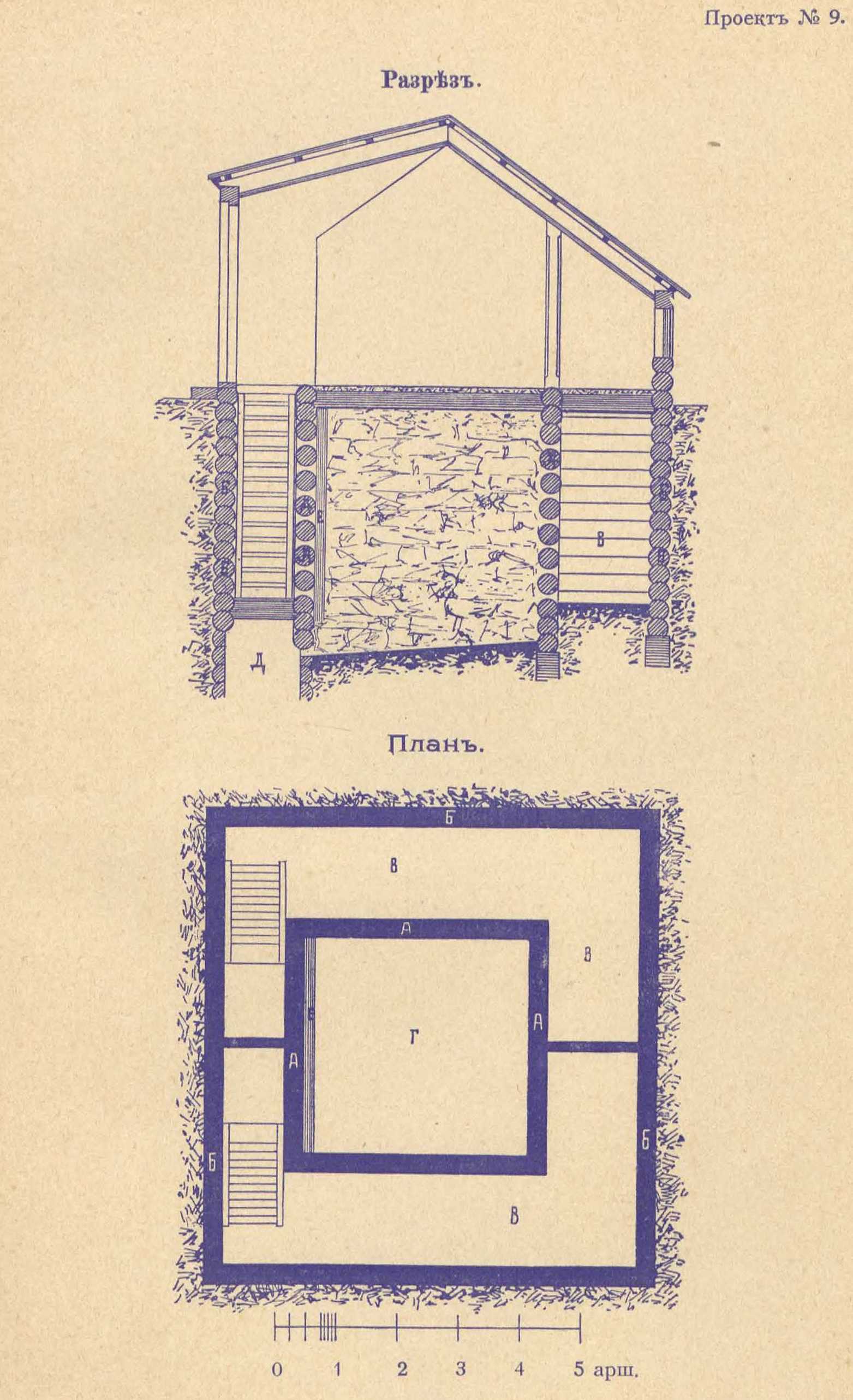 Проект представляет рисунки плана и разреза для устройства ледника. Помещение ледника (лит. В), предназначенное для хранения продуктов, предполагается принадлежностью для двух квартир. Устройство ледника представляется таковым: сруб (лит. А) сделан из круглого леса; в помещении такого сруба укладывается лед. Сруб делается не обыкновенной рубкой, но в таком срубе между бревнами оставляются промежутки (как показано на чертеже); промежутки эти делаются для того, чтобы охлажденный воздух от льда мог в большей мере проникать в те помещения ледников, где сохраняются продукты. Около стенки сруба, выходящей к наружной двери (стенка в срубе лит. А, около которой помещены лестницы), для предупреждения проникания сквозь промежутки между рядами бревен теплого наружного воздуха в летнее время, делается, между стенкой и льдом, простилка из соломы (лит. Е) толщиною от 2 до 3 вершков. Помещение ледников, назначенное для хранения продуктов, образуется устройством второго сруба (лит. Б). Сверх ледников настилается пол с насыпкою земли.