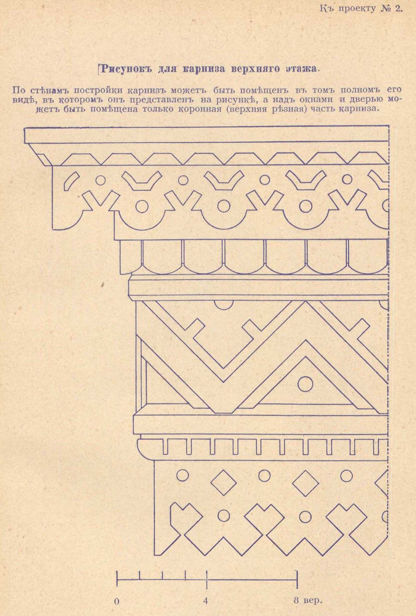 К проекту № 2. Архит. А. Козлов. Рисунок для карниза верхнего этажа. По стенам постройки карниз может быть помещен в том полном его виде, в котором он представлен на рисунке, а над окнами и дверью может быть помещена только коронная (верхняя резная) часть карниза. |