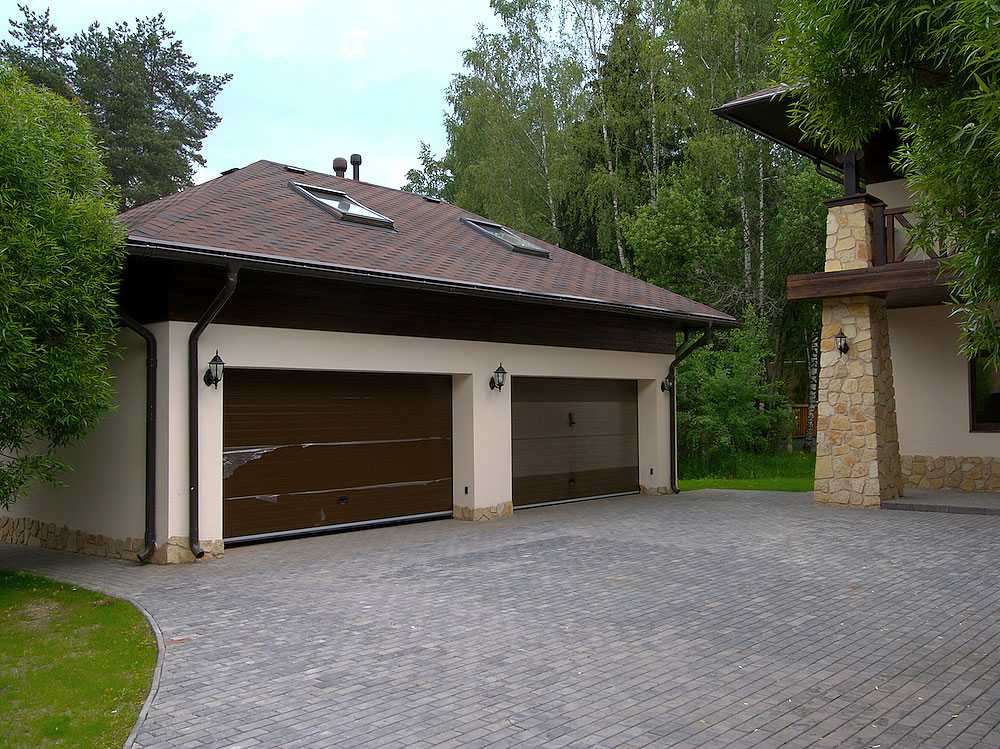 - гараж под одной крышей с коттеджем. Обе постройки возводятся на одном фундаменте. За счет этого удается значительно сэкономить на проектировании и строительстве;