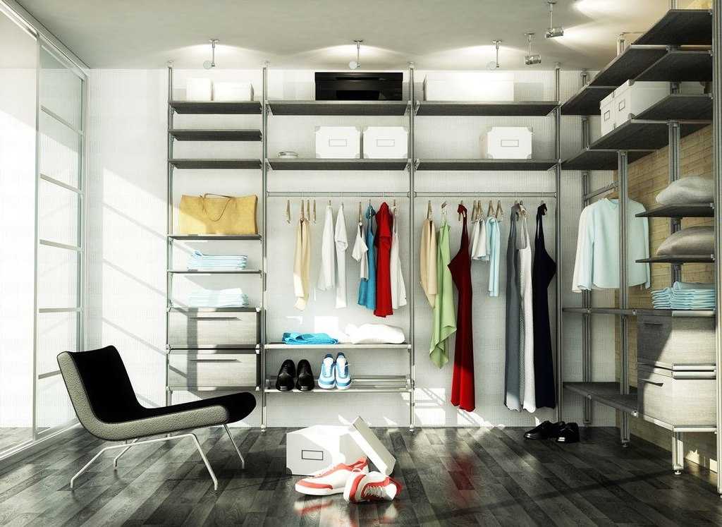 - Каркасные. Это система металлических штанг и направляющих, на которых крепятся полки, вешалки для тремпелей, ящики для белья. Удобны для отдельных гардеробных комнат.