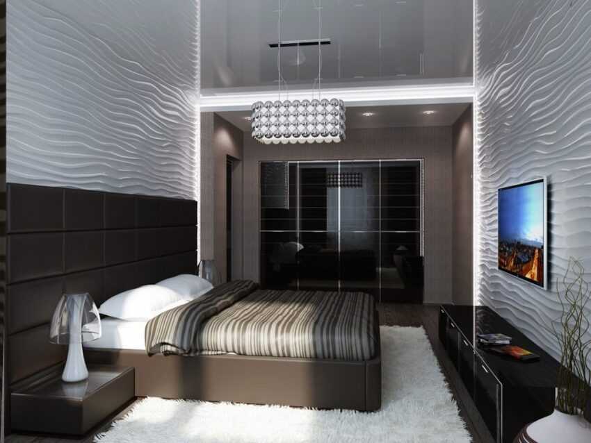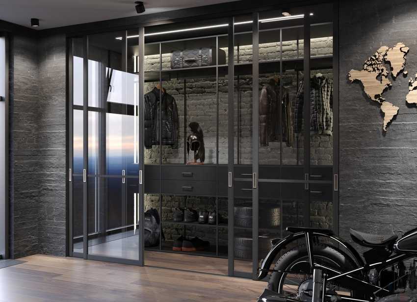 Там, где в почете минимализм, лофт или хай-тек, стены и пол гардеробной оформляют созвучно стилю: под кирпичную кладку, бетон, тонированным стеклом, керамогранитом.
