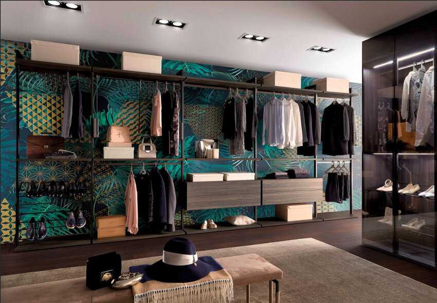 Для открытой гардеробной выбор не велик — она должна соответствовать комнате: либо точно соответствовать стилю комнаты, либо хотя бы гармонично вписываться в нее.