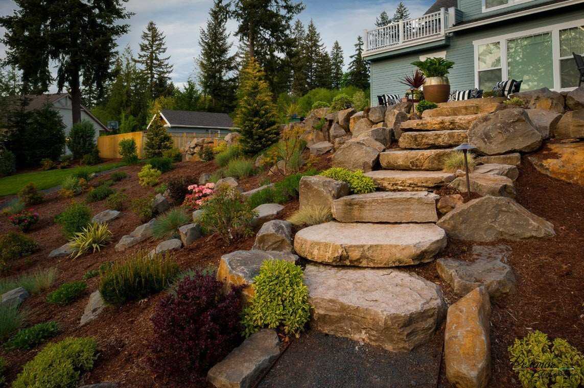 Камни – это отличный вариант для оформления альпийской горки, рокария и других оригинальных арт-объектов. С их помощью можно выложить ступеньки к пруду или разнообразные мощеные дорожки.