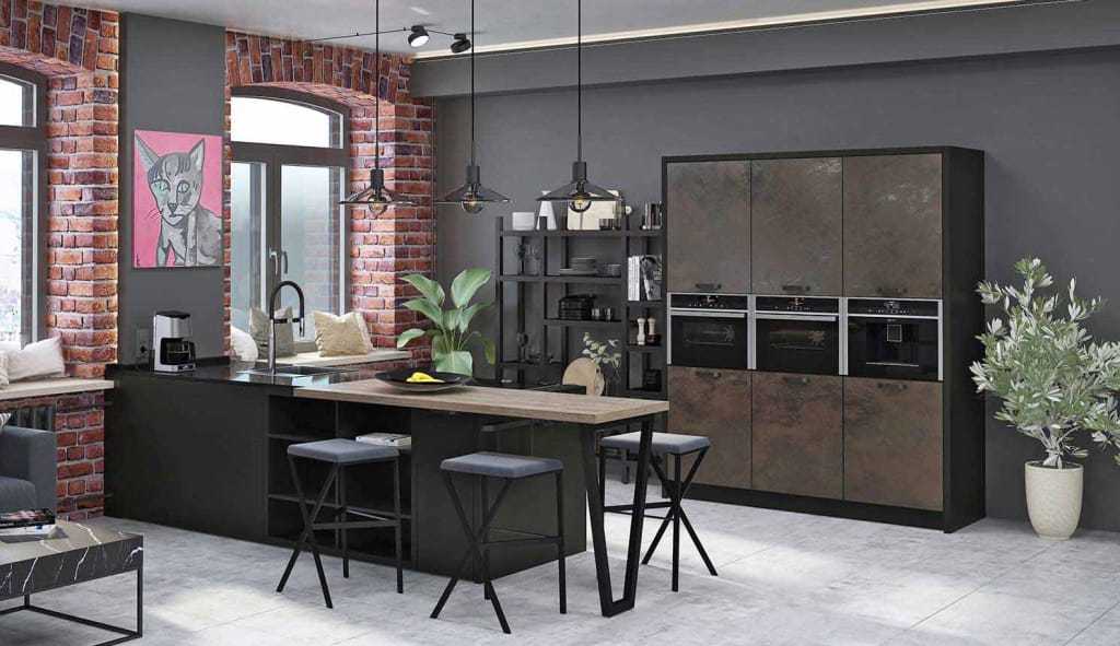 Темные тона выглядят брутально. Но если кухня небольшого размера, то стоит отдать предпочтение светлым фасадам или разбавить темный низ гарнитура белым верхом.