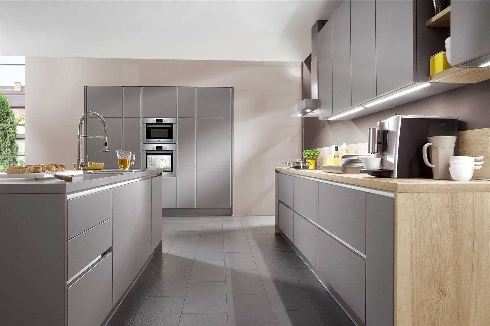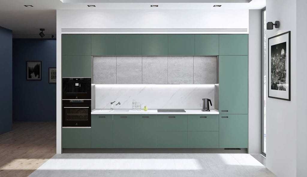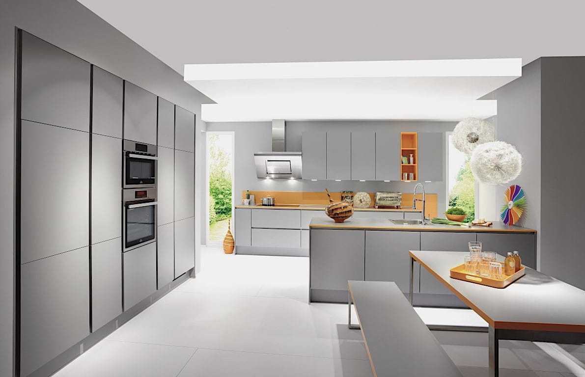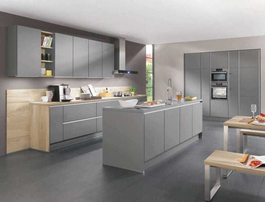 Еще одно современное прочтение классики. Традиционный дизайн гарнитура с фасадами с рамками и филенками в сером цвете идеально впишется в просторную П-образную или островную кухню.
