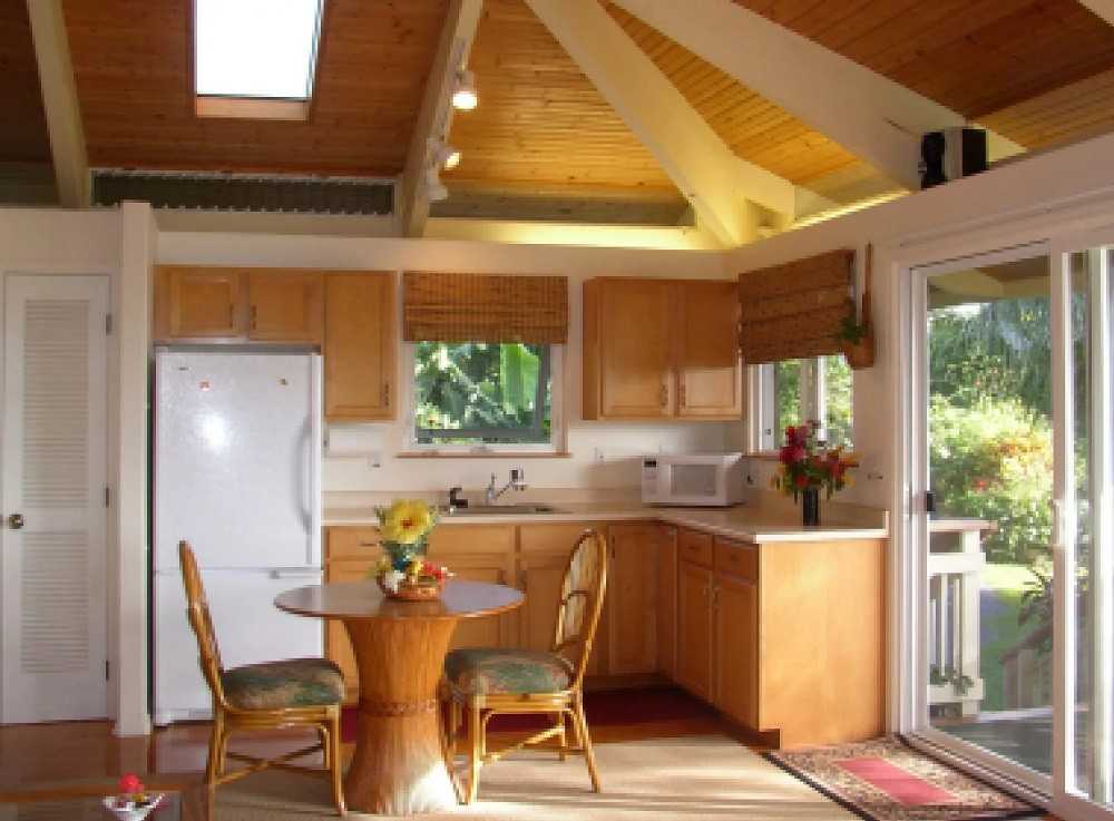 В небольшом домике лучше всего для расширения пространства совместить кухню с гостиной. Кухня-гостиная может плавно перетекать на террасу с барбекю, в зоне гостиной можно расположить диван и большой стол, для кухни отвести 1/3 пространства.