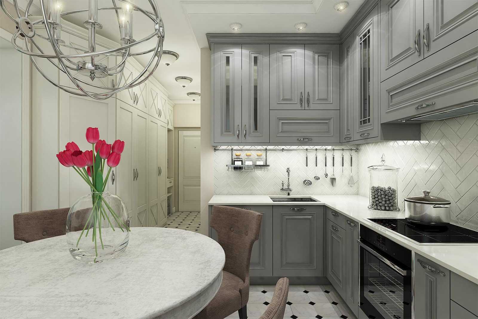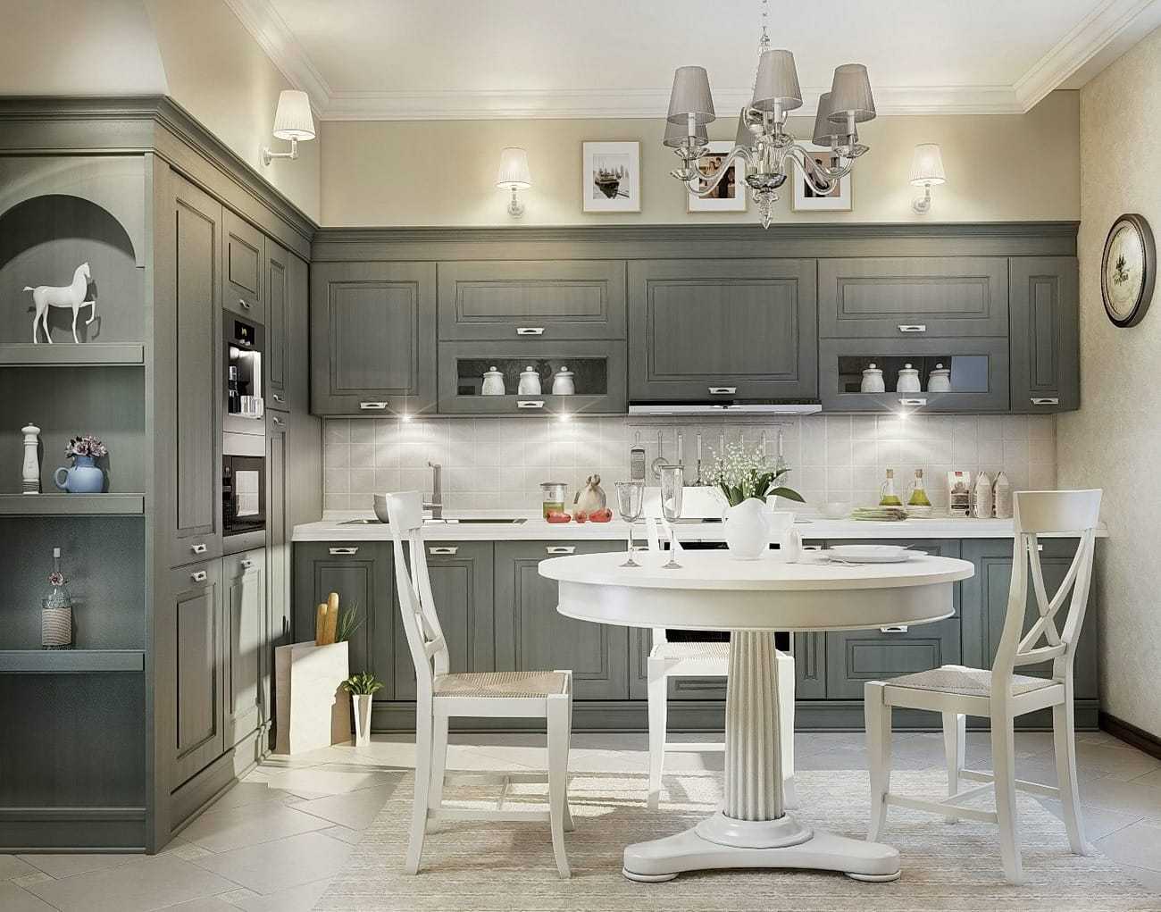 Неоклассика в серых тонах – отличная альтернатива бежевым традиционным интерьерам с массивной мебелью. Строгий серый гарнитур украсят элегантные классические золотые ручки – под античную латунь, бронзу, кованые и т.п.
