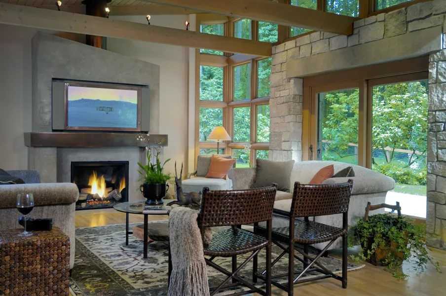 На фото интерьер с камином закрытого типа, которым можно любоваться без присутствия запаха дыма в доме.