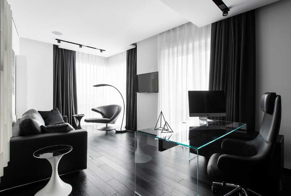 Чёрно-белый деловой кабинет в современном стиле выглядит очень представительно и модно. Холодность ахроматической схемы компенсирована плавными контурами мебели. В таком решении чёрный цвет задаёт мотив строгости и элегантности, а белый – делает комнату светлой и опрятной.