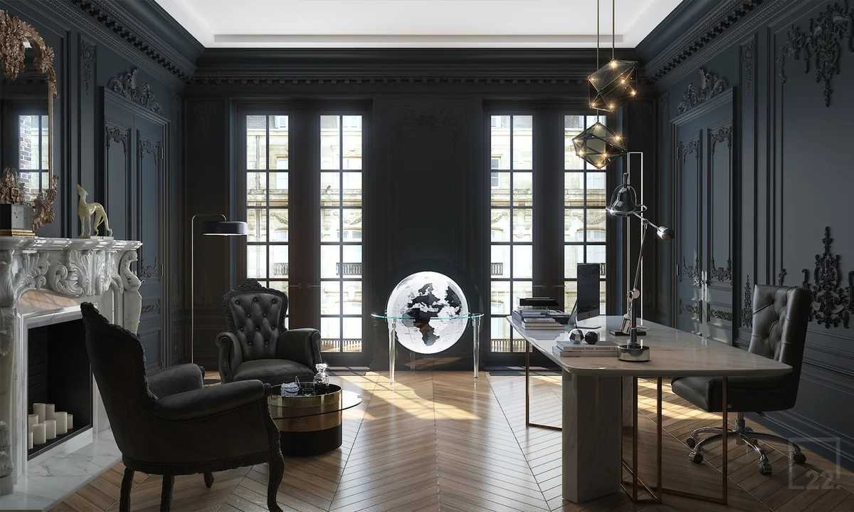 Совет: обратите внимание на ультрасовременный декор с подсветкой, делающий ретро-обстановку немного стимпанковой. Роскошный кабинет в дворцовом стиле, сочетание чёрного и золотого