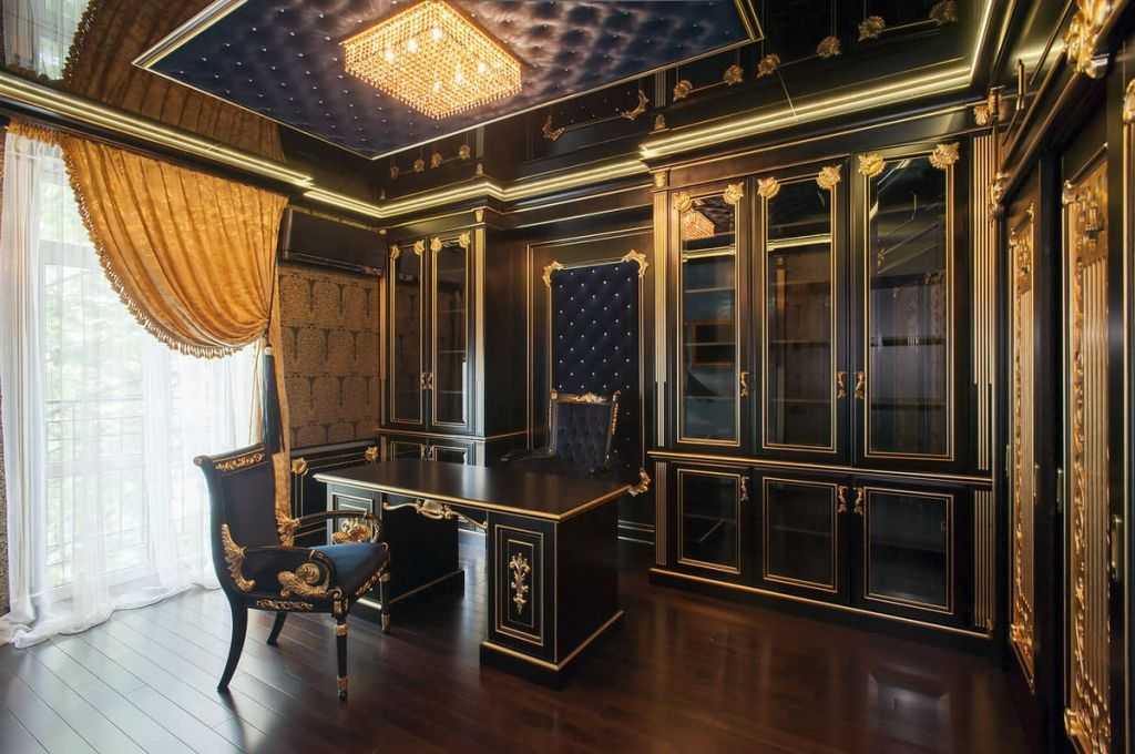 Роскошный кабинет в дворцовом стиле, сочетание чёрного и золотого
