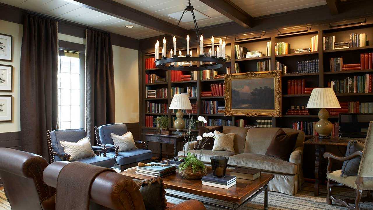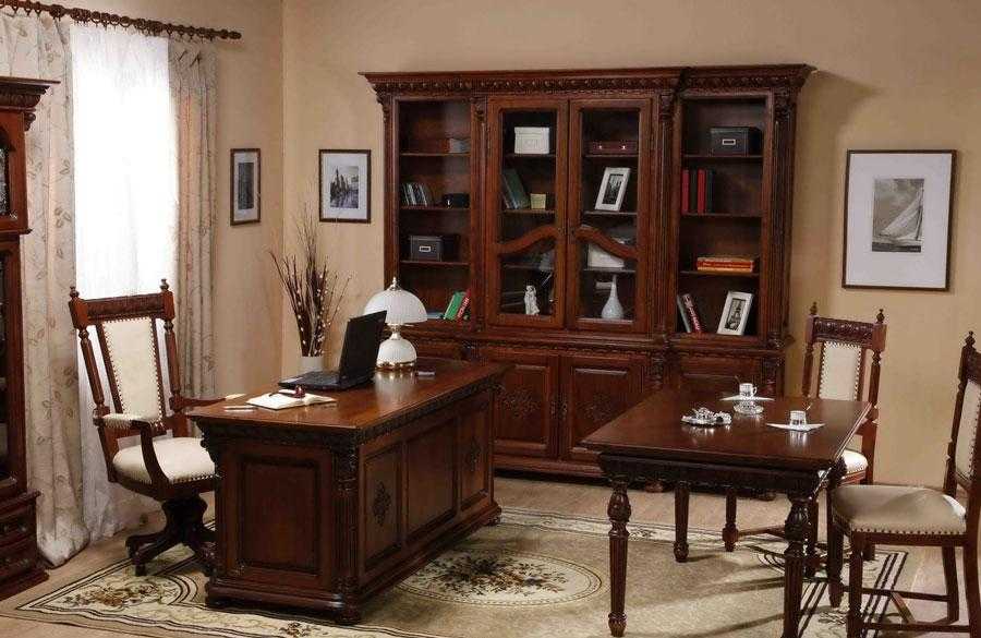 Обязательными элементами любого классического кабинета являются удобный письменный стол и уютное кресло. Если помещение предназначено также для приема посетителей, то устанавливают кофейный столик и мягкие диваны.Дизайн рабочего кабинета в классическом стиле предполагает обязательное наличие книжных полок или полноценной библиотеки, шкафов для демонстрации сувениров, наград, кубков. Корпусная мебель должна быть выполнена из натуральной древесины, при ограниченном бюджете можно использовать имитацию, но максимально реалистичную. Диваны и кресла оббиваются кожей, могут украшаться каретной стяжкой.