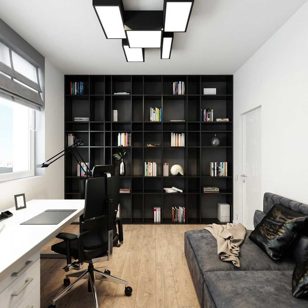 Чёрный стеллаж играет роль акцентной стены, а деревянный пол создаёт тёплую дружественную атмосферу, так необходимую для домашнего кабинета. Окно выгодно использовано как естественный источник света, а двухцветная люстра соединяет дизайн интерьера в единую гармоничную картину.