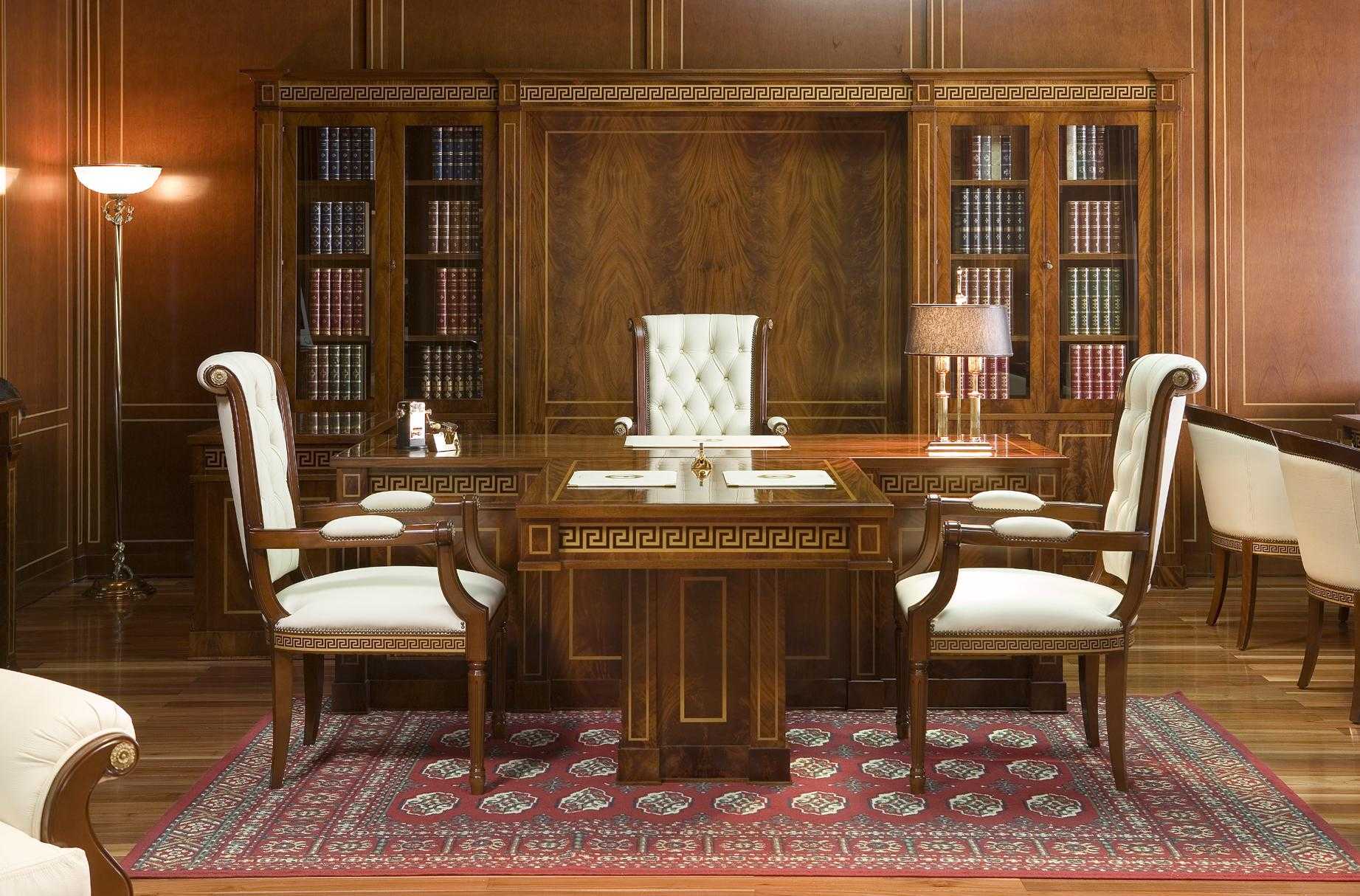 Массив дерева подчеркивает высокий статус, консерватизм и богатство лидера. Главной фигурой в меблировке является письменный стол, который выполняется нарочито громоздким и символизирует стабильность и прочное положение на рынке и в обществе. Мебель под дерево создает нотку природности и гармоничности. На постсоветском пространстве такая обстановка традиционна. Кто-то может оформить все четыре стены комнаты деревом. Однако не каждому человеку такое обилие по вкусу.