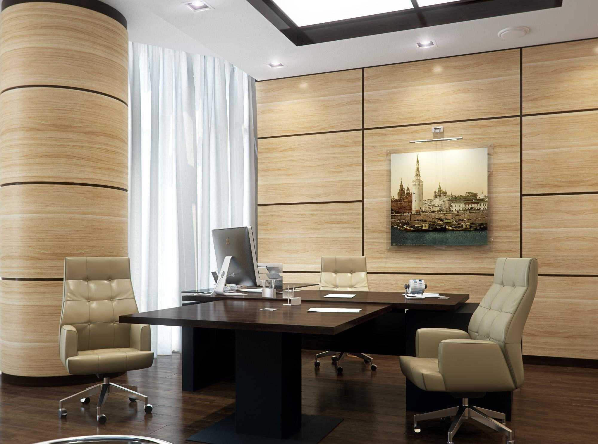 Выгоднее всего будет смотреться строгий дизайн с небольшими акцентами, указывающими на принадлежность помещения. Вместо картин на стенах лучше разместить грамоты и награды, можно лишь самые важные, если их много. Мебель также не должна напоминать о домашней обстановке, пусть это и очень удобно. При желании можно поставить диван: вариант по умолчанию — это однотонный кожаный, но никак не пестрая расцветка. Помимо рабочего стола должен быть предусмотрен стол для совещаний и переговоров, умещающий большее число людей.