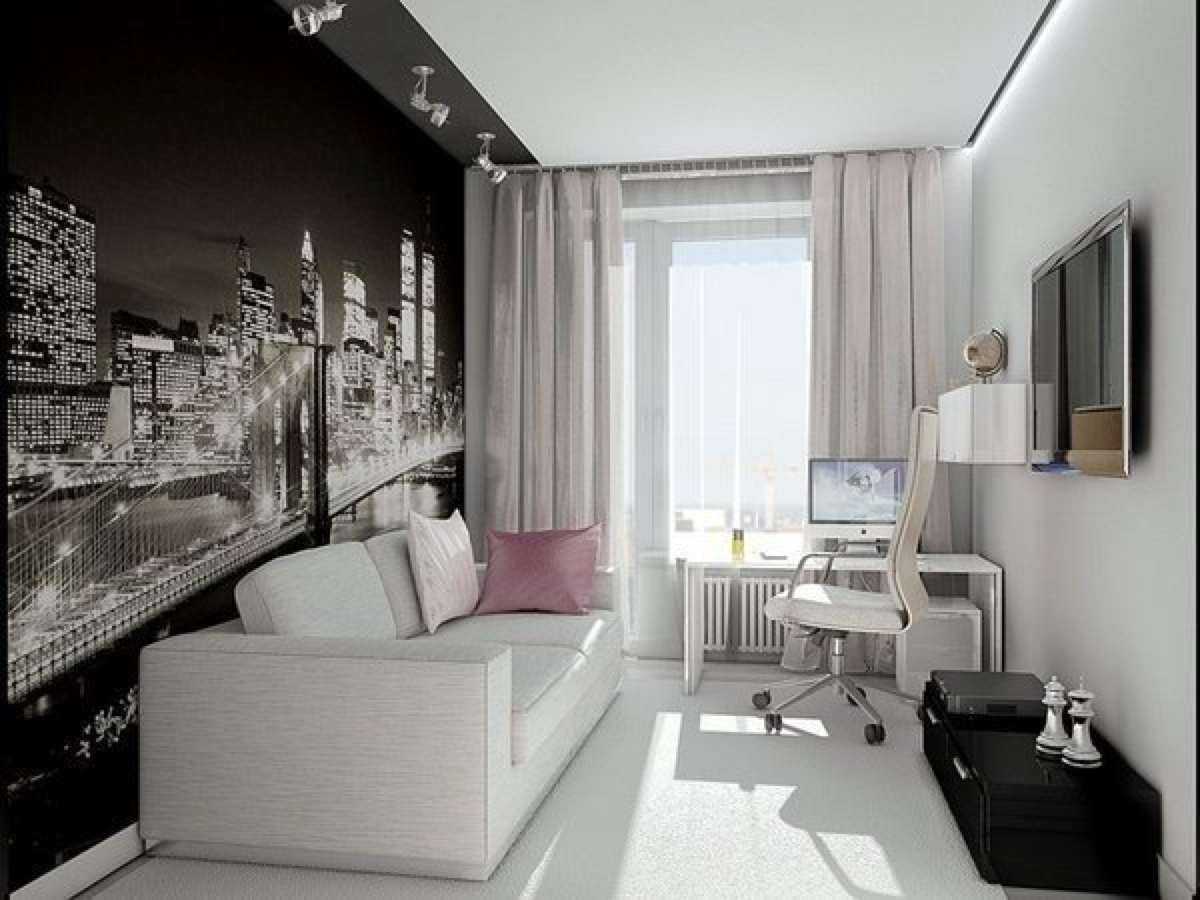 Обои в данном помещении, чаще всего имеют принт, в виде вертикальных полосок, геометрической абстракции или природных мотивов. Для оформления прекрасно подойдут фотообои с панорамными изображениями городов, ночных мегаполисов и прочих рисунков. По цвету, стены, могут быть выполнены в любой оттеночной гамме, однако лучше всего будет отдать предпочтение пастельным тонам, способствующим релаксу после напряженного рабочего процесса.
