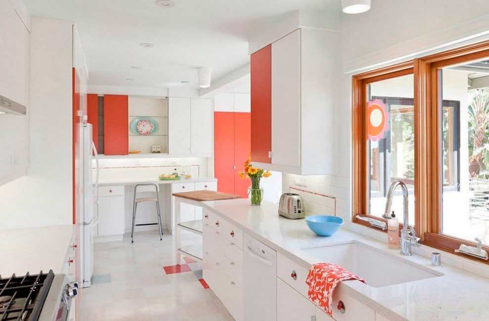 Стоит обратить внимание на кухни винтажного или ретро-стиля. Красный холодильник, плита или пластиковые табуреты в соединении с белым гарнитуром встречаются здесь достаточно часто