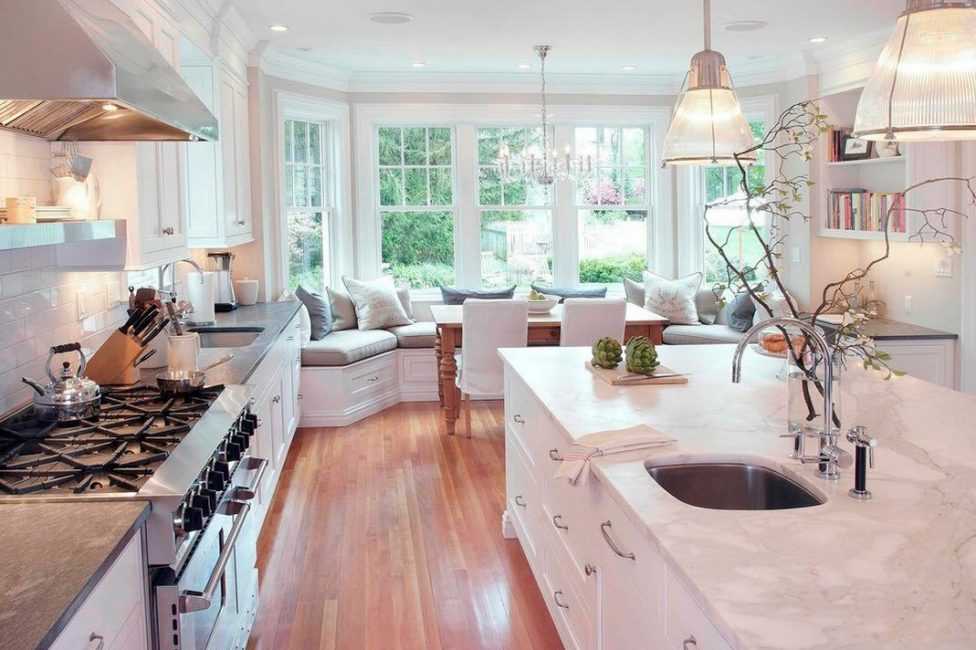 Белая кухня с уютным мягким уголком возле окна соберет множество гостей