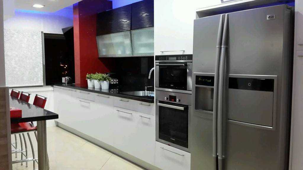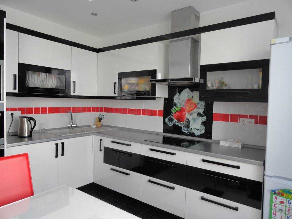 К примеру, отлично будет выглядеть сочетание белого гарнитура и красного фартука. Красными могут быть некоторые предметы мебели и бытовой техники — стулья, холодильник, микроволновая печь и т. д.