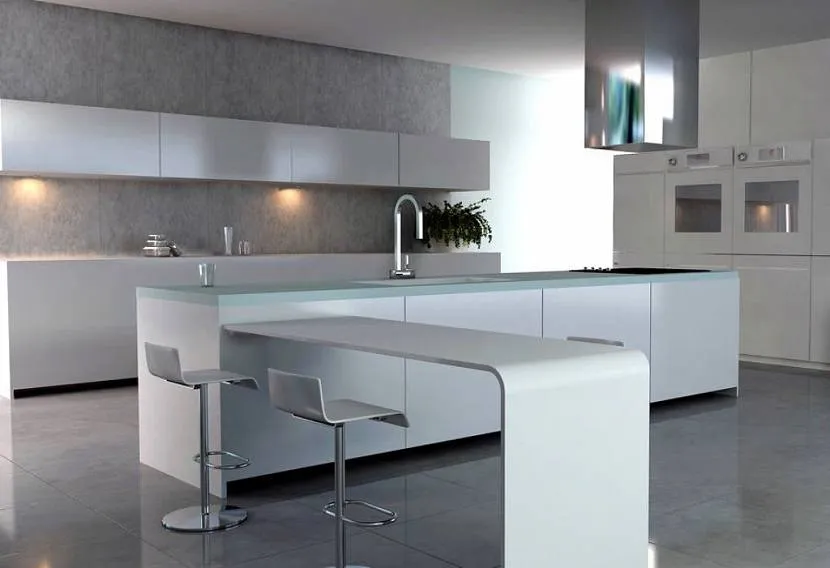 Кухни белые глянцевые угловые или не угловые предполагают использование в интерьере и других материалов, например, натурального или искусственного камня. Достоинства материала налицо, ведь материал обладает устойчивостью к внешним воздействиям, является долговечным материалом. Однако стоимость его высока, поэтому придется потратить немало денег для достижения эффекта, который вы хотите получить.