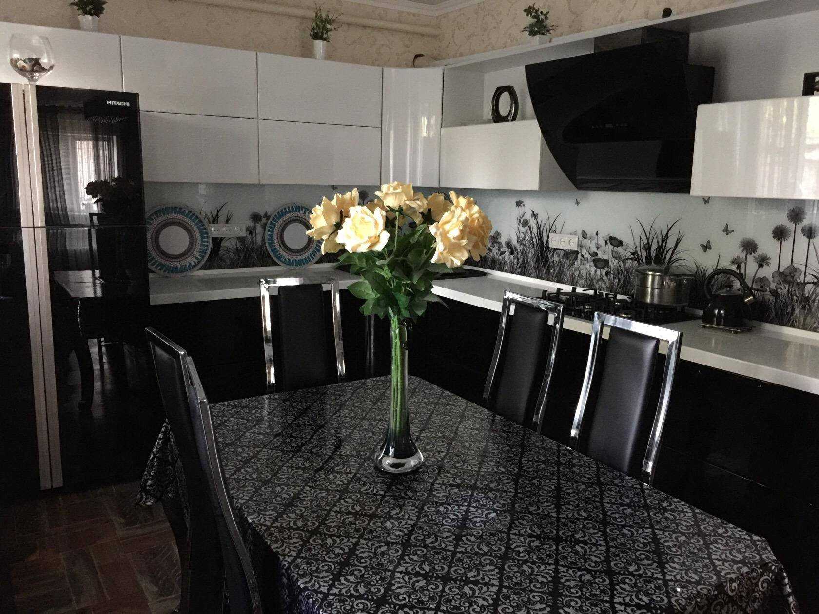 Стильный современный гарнитур из МДФ с черным стеклянным фартуком