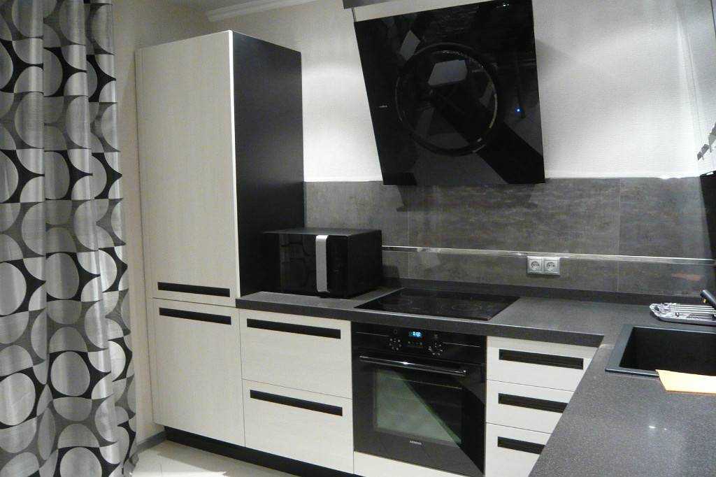 Чтобы кухня выглядела элегантно, белый свет сочетают с черным, а завершающим штрихом этой комбинации считаются элементы интерьера с древесной текстурой. Пример на фото.