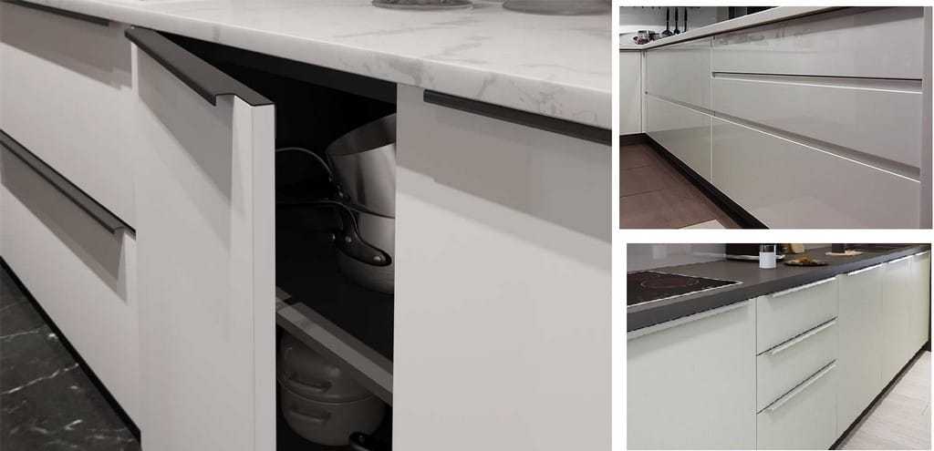 - Откажитесь от нажимных механизмов. Лучше, чтобы белая кухня имела накладные или хотя бы врезные ручки. Особенно, если фасады глянцевые.
