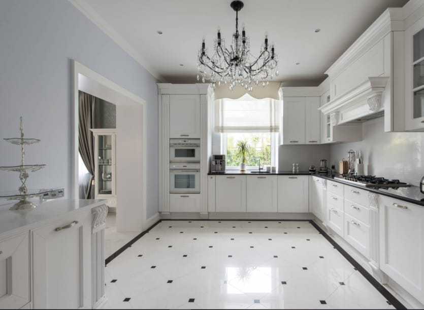 Немного театральный стиль, яркий, импозантный, характеризуется обилием антикварных мебельных конструкций, необычным декором, материалами. Белая кухня — это традиционный выбор ар-деко. Для него свойственно сочетание белого и черного, коричневого, шоколадного. Остальные оттенки сведены к минимуму и появляются только в виде небольших акцентов. Нередко можно видеть отделку пола керамической плиткой в виде шахматной доски.