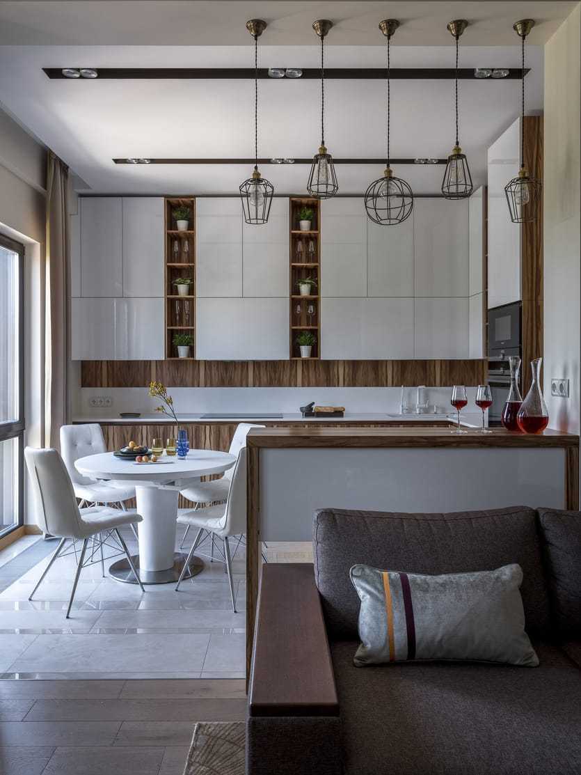 Кстати, дерево не обязательно должно быть в своем родном цвете. Окрашенный, например, в светло-серый тон деревянный потолок, сохранит главный акцент на светлой деревянной столешнице, но в то же время не будет сливаться с общей белизной стен и мебели.