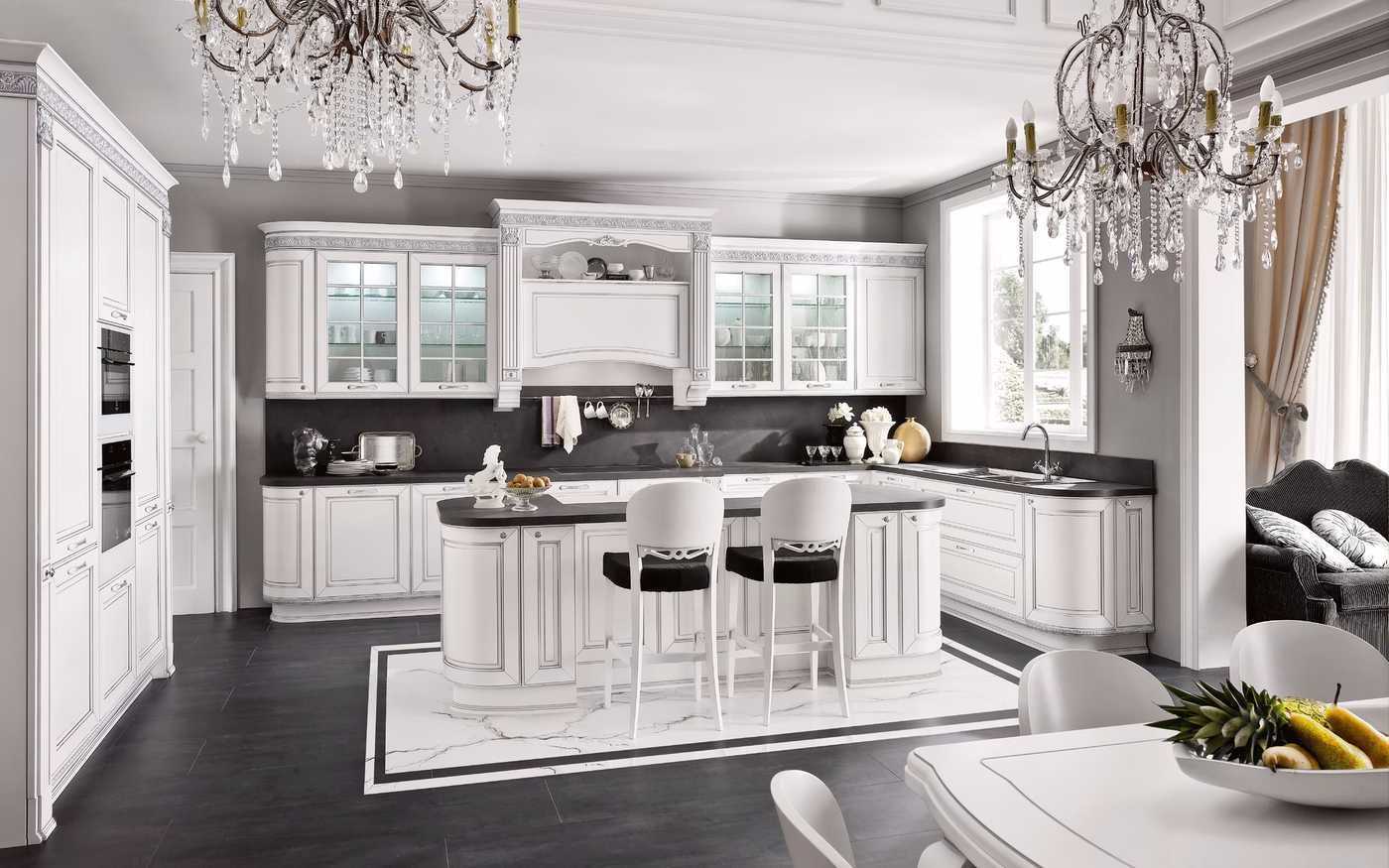 Такая кухня может похвастать необычными элементами в виде белых колонн, фресок на стенах. Белые фасады соседствуют с мраморной столешницей и мозаичным фартуком. Мебель имеет строгие формы, возможно присутствие резьбы. Разбавить яркий белый цвет призваны другие светлые оттенки, например, бежевые или серые стены.