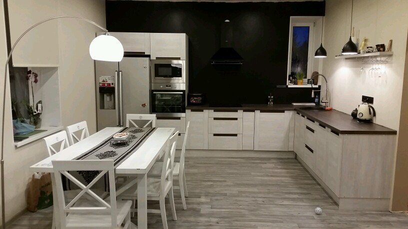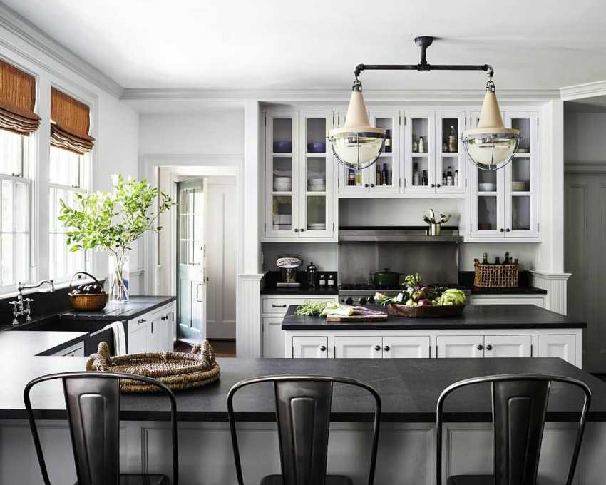 В правильном соотношении со светлыми оттенками он может даже визуально отдалять предметы. Например, черный потолок на светлой кухне однозначно не будет казаться низким, а стена черного цвета будет прекрасно гармонировать с тремя остальными светлыми, делая кухню шире.