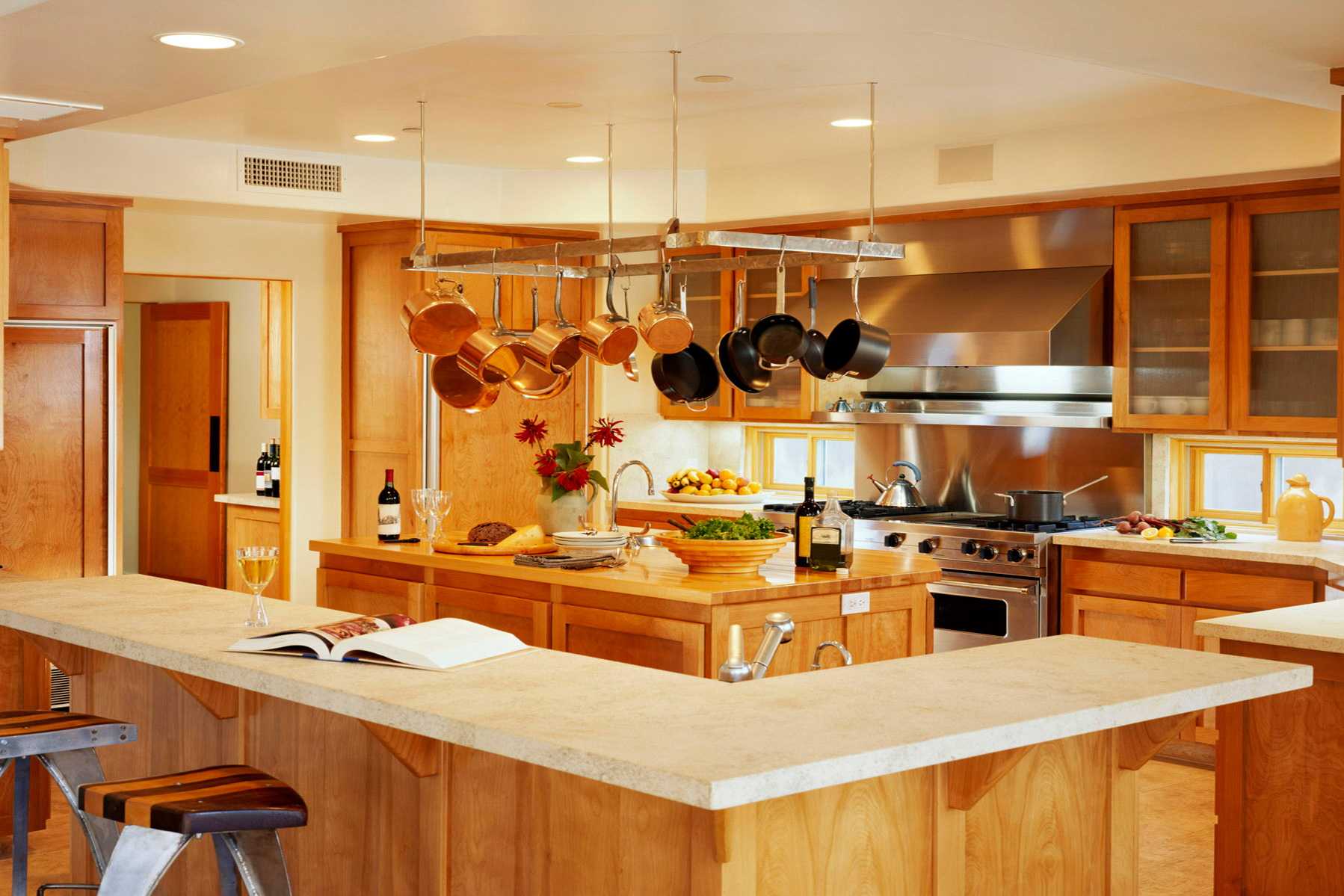 Кухонные гарнитуры кухни в частном доме создаются из дорогих сортов дерева: тика, лиственницы, красного дерева, реже — рябины, венге. Допустимо сочетать дерево со сталью.