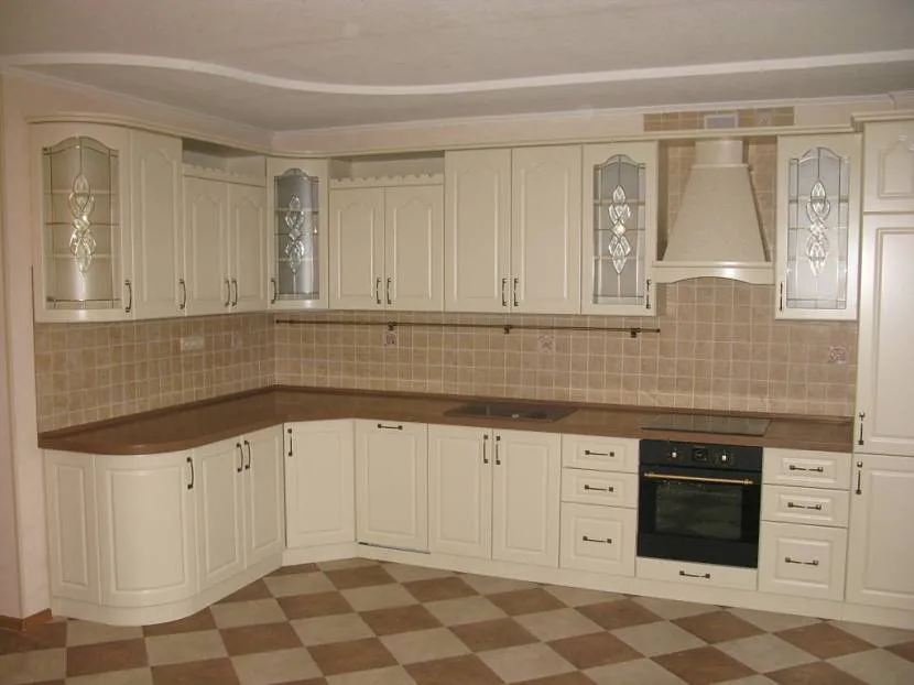 Кухонная мебель в бежевых тонах всегда популярна, изготавливается в разных стилях, нередко имеет элементы другого цвета, что сразу решает проблему выбора контрастного цвета.