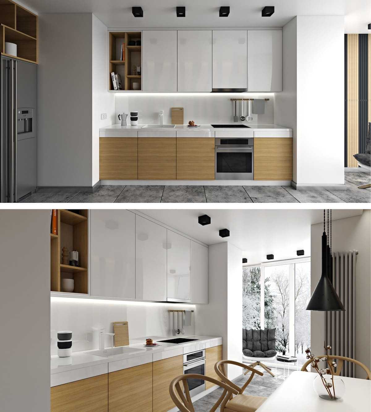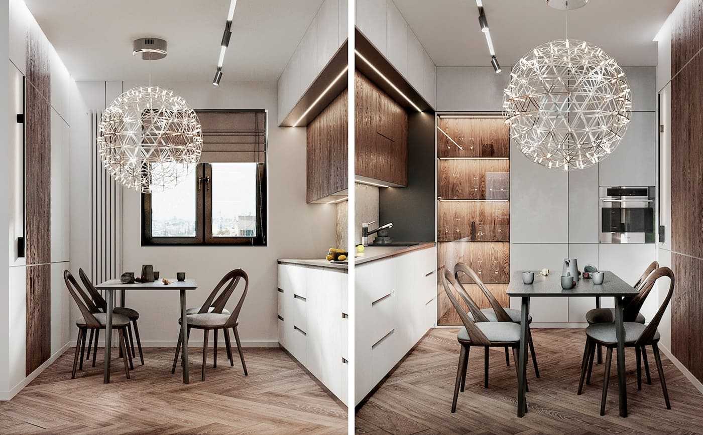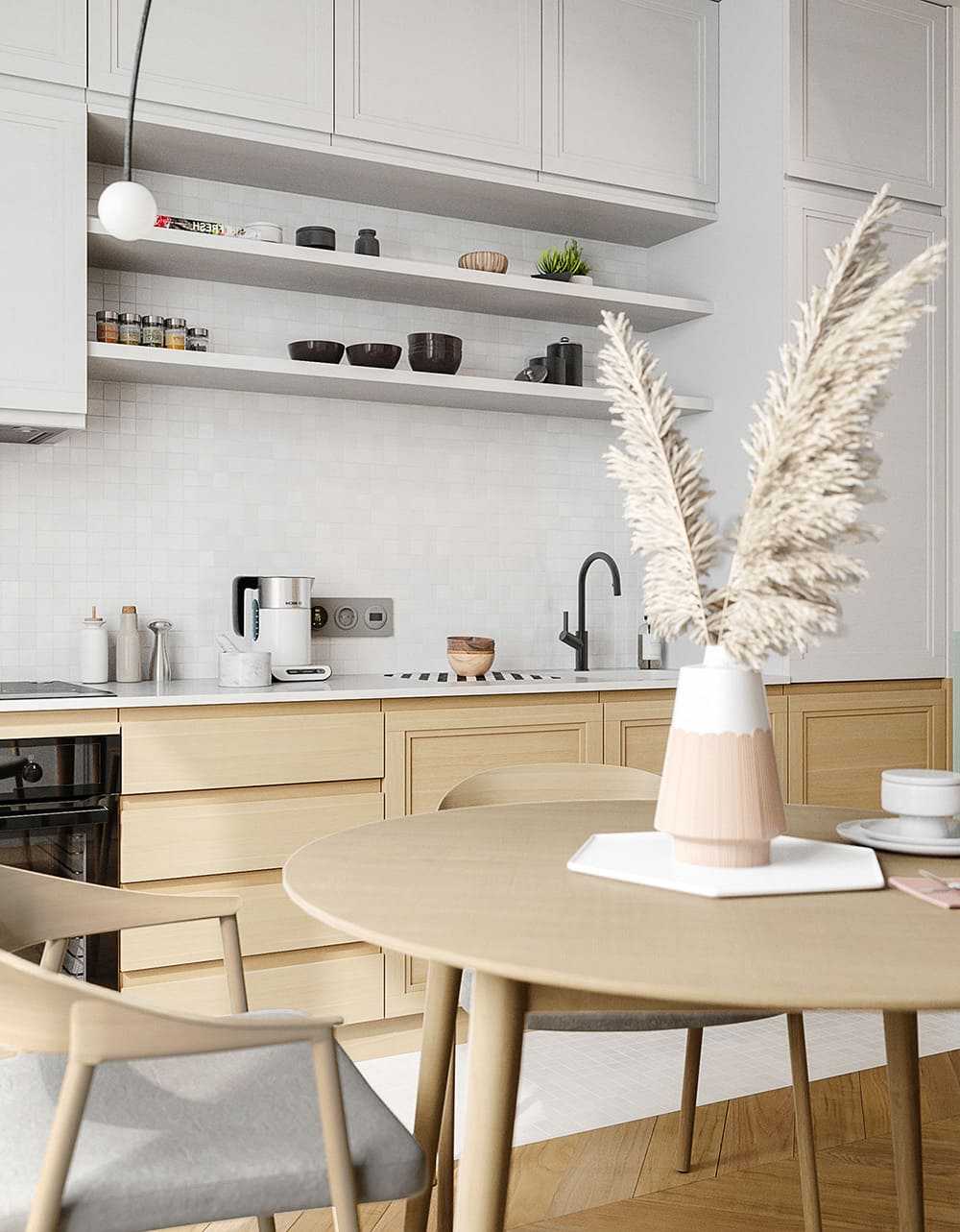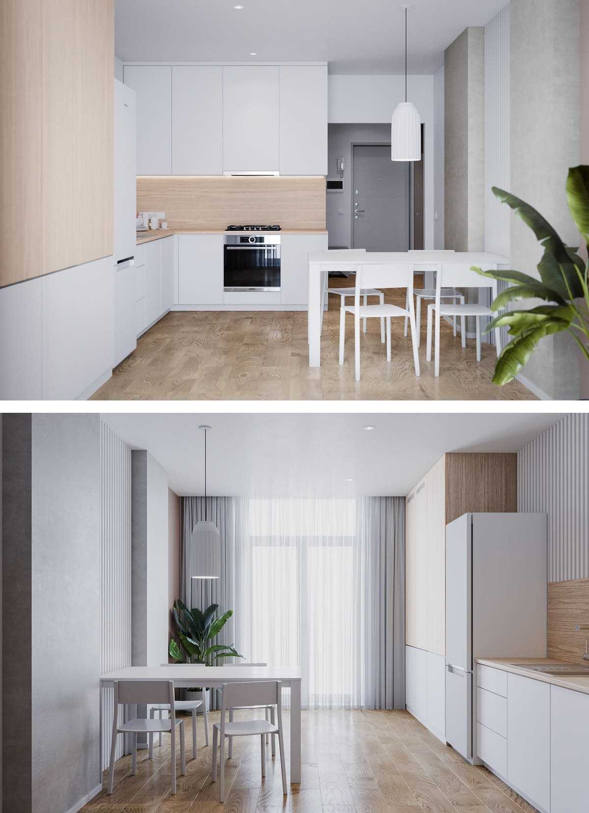 Такие варианты дизайнерского решения помогут крыть все недостатки геометрии кухни, а также продлят срок эксплуатации отделки и гарнитура за счет минимального износа светлых поверхностей.