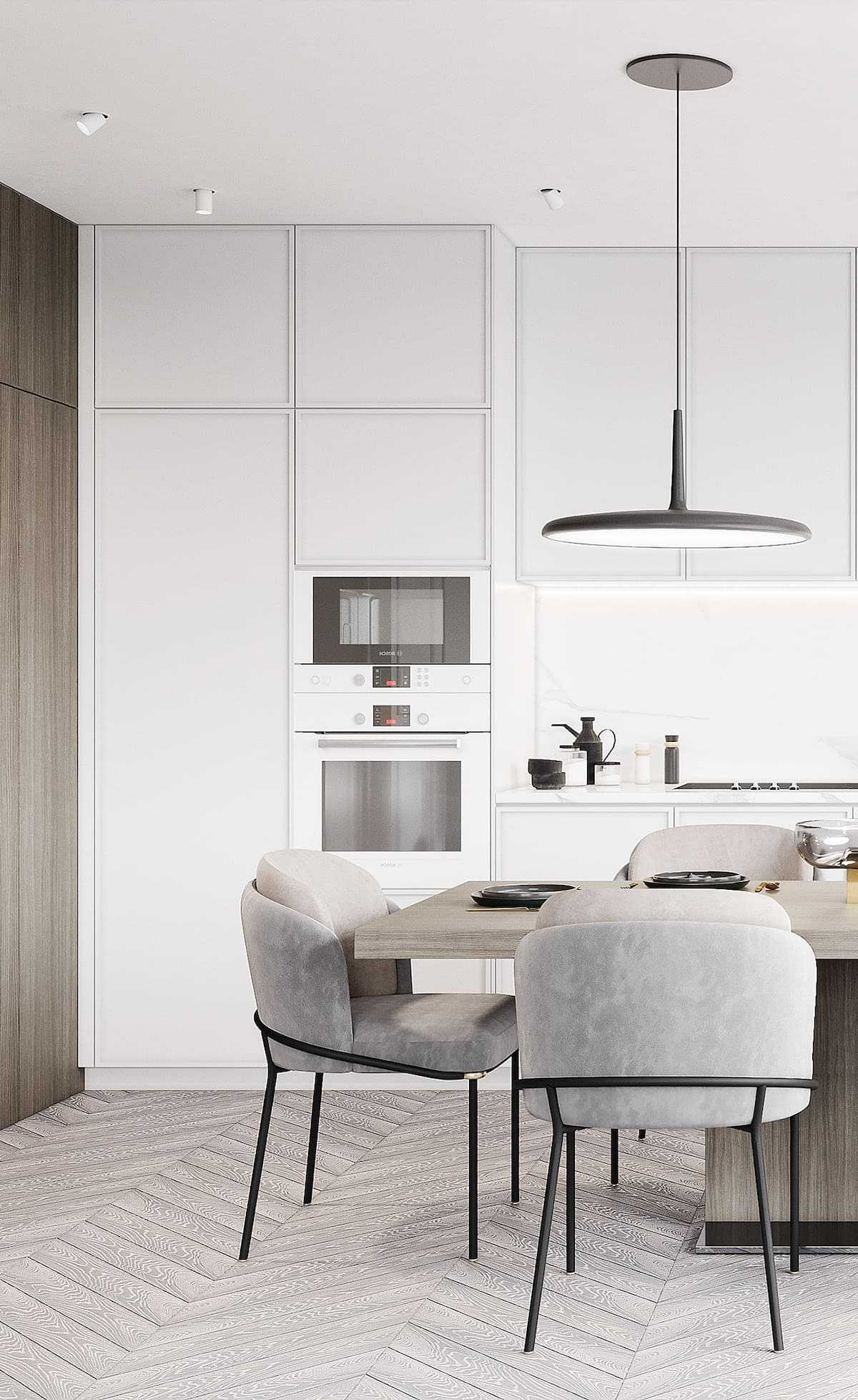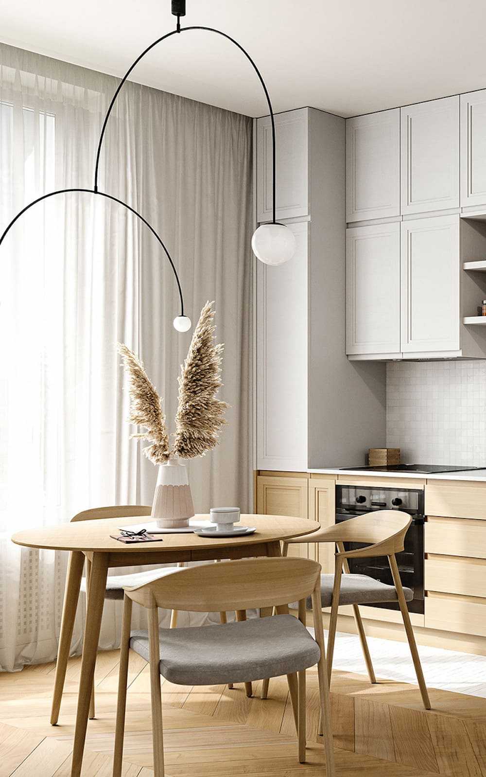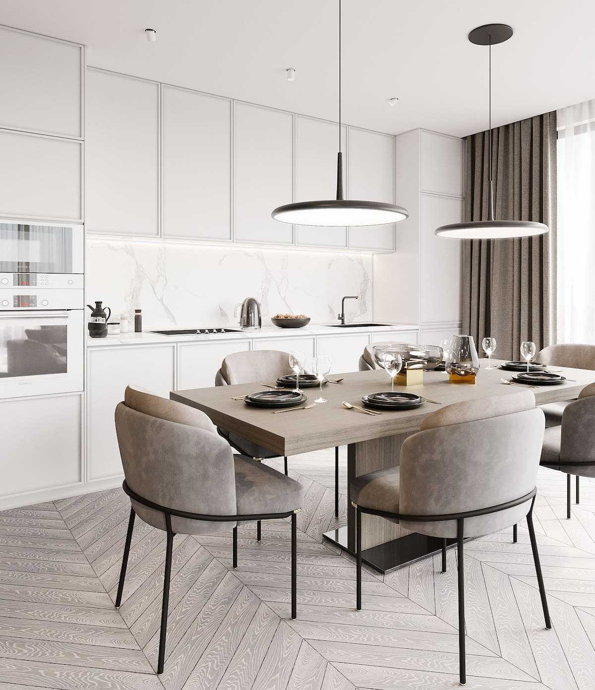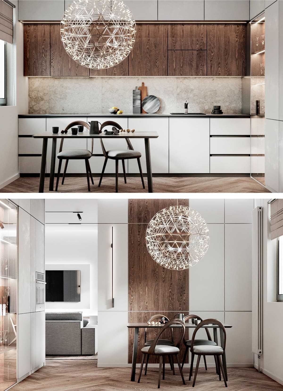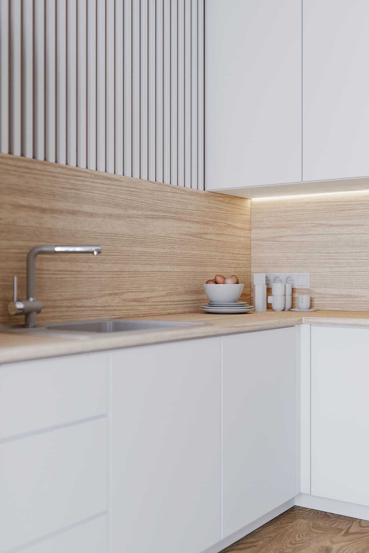 Такие варианты дизайнерского решения помогут крыть все недостатки геометрии кухни, а также продлят срок эксплуатации отделки и гарнитура за счет минимального износа светлых поверхностей.