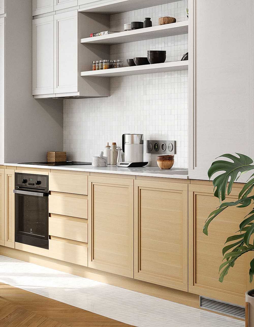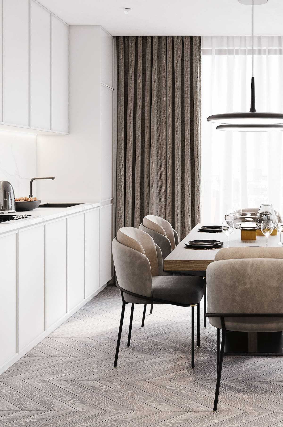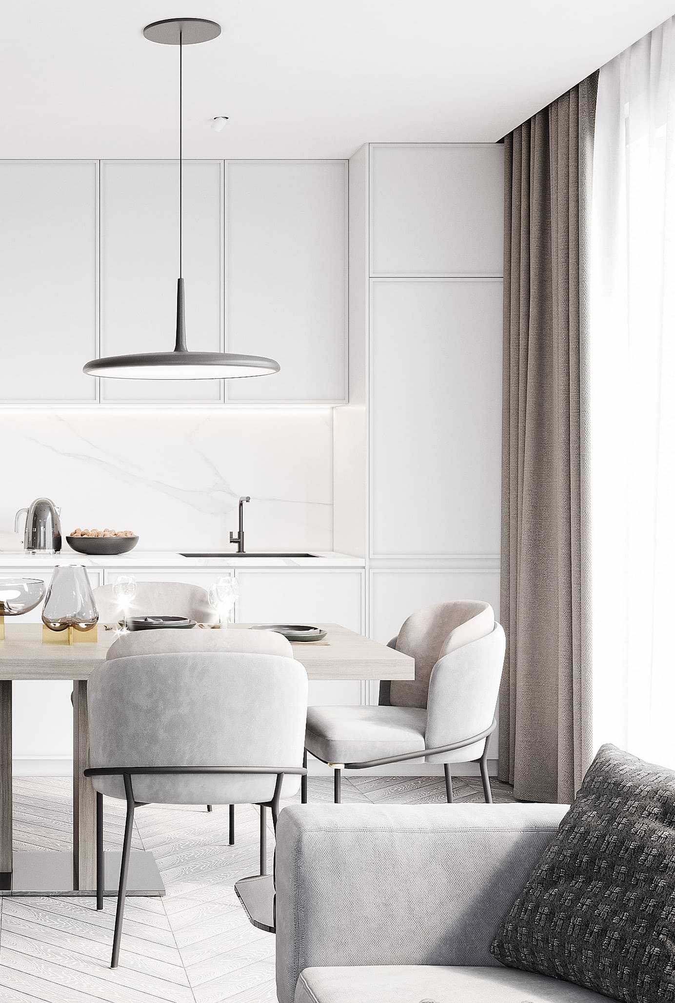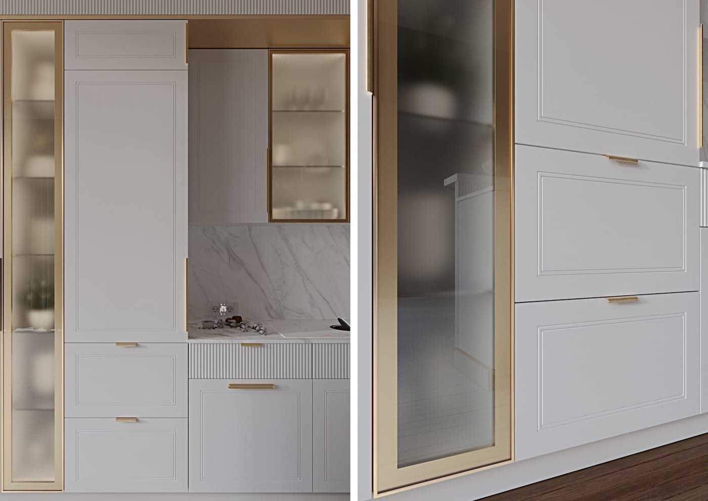 Такие варианты дизайнерского решения помогут крыть все недостатки геометрии кухни, а также продлят срок эксплуатации отделки и гарнитура за счет минимального износа светлых поверхностей.