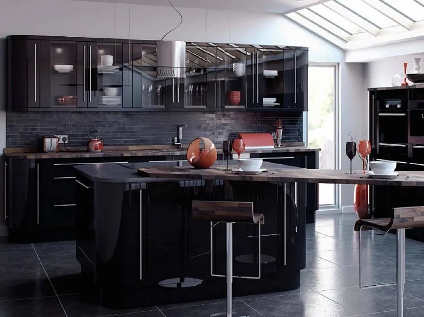 глянцевые фасады черной кухни зрительно увеличивают пространство