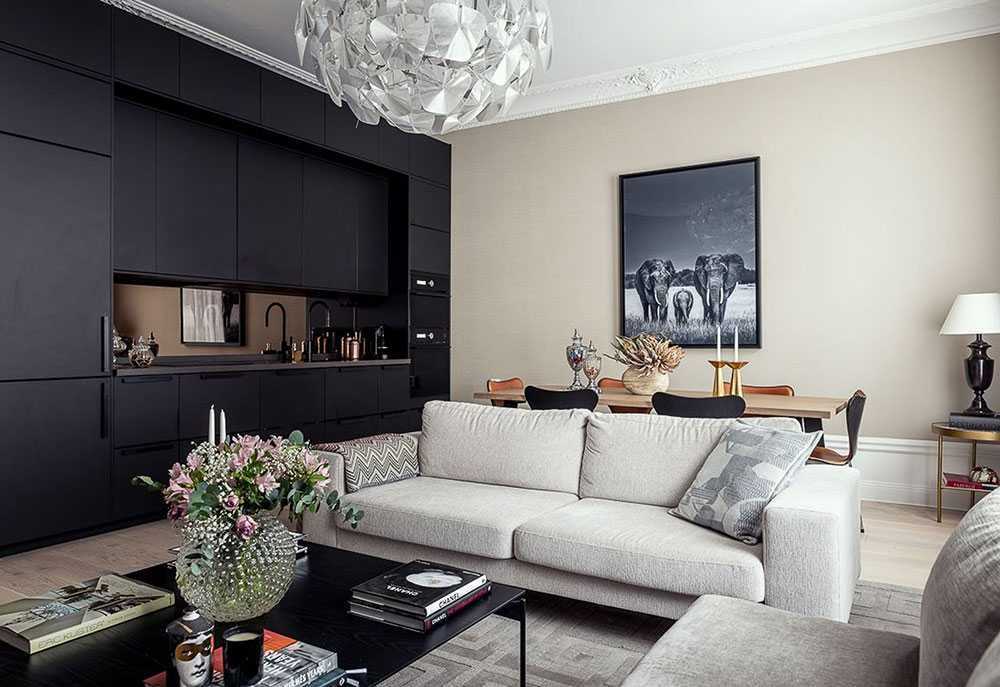 Ещё один пример планировки гостиной, кухни и столовой в одной комнате. Здесь для демонстрации различных зон использована полностью чёрная кухонная мебель. Относительно небольшое пространство не позволило сделать больше. Однако, нельзя сказать, что резкий контраст разбалансировал данный интерьер.