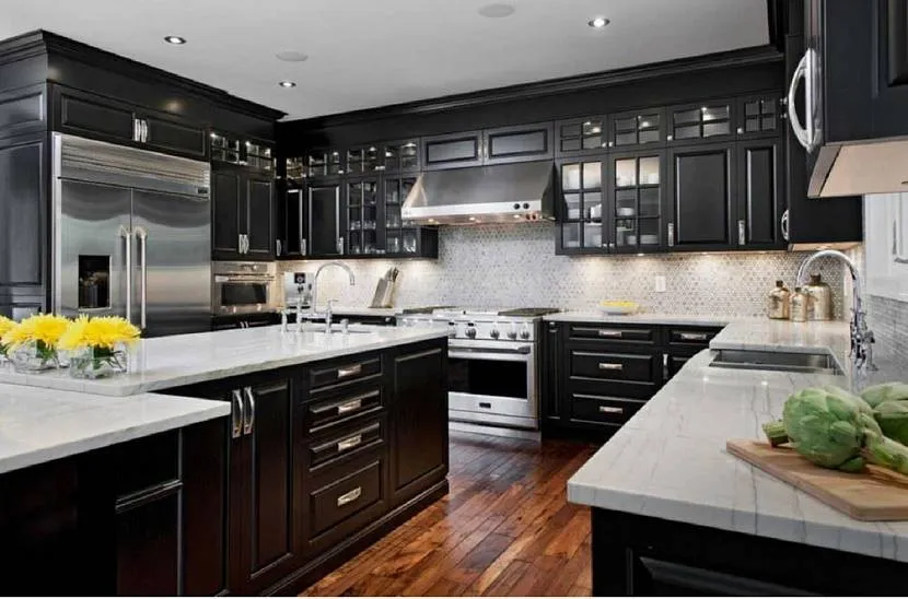 Самые распространенные и доступные варианты оформления поверхностей для кухонь в черном цвете: