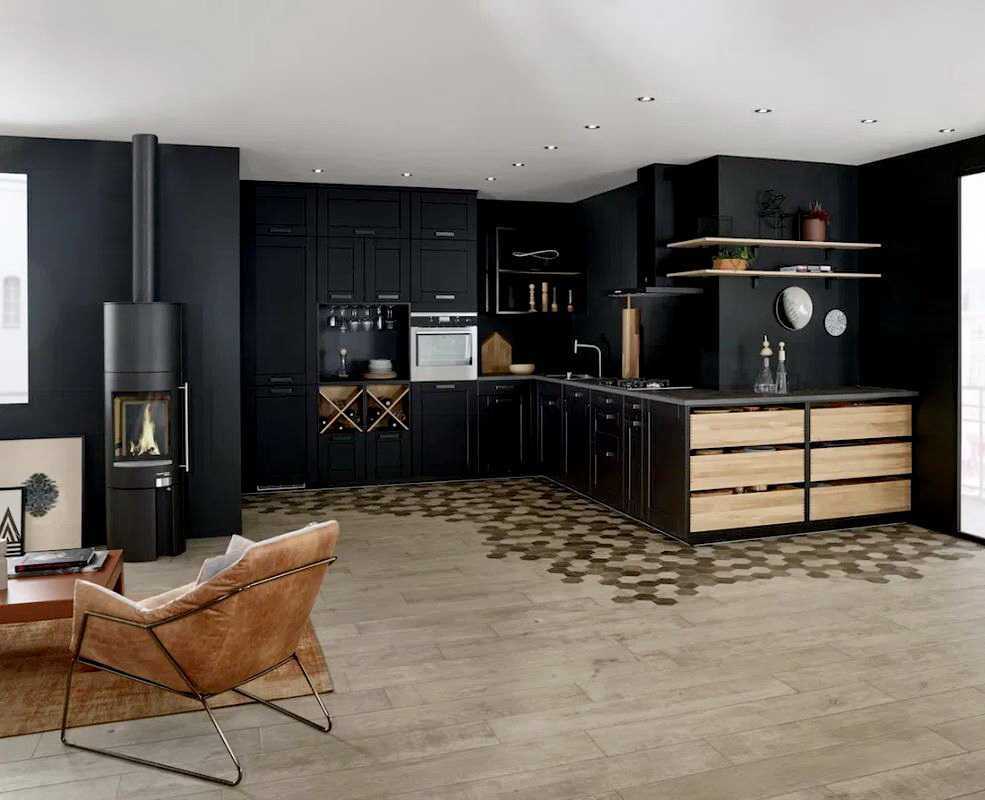 Для тех, кто хочет разнообразить интерьер своей кухни, отличным выбором станет мебель комбинированных цветов. Так, часть фасадов кухонных гарнитуров может быть чёрными, а часть — другого цвета. Стоит отметить, что на черной кухне чаще всего можно встретить комбинации с цветами из тёплой гаммы: жёлтым, оранжевым, красным, светло зеленым. С их помощью нейтрализуется холодность и мрачность интерьера, а помещение наполняется домашним уютом.