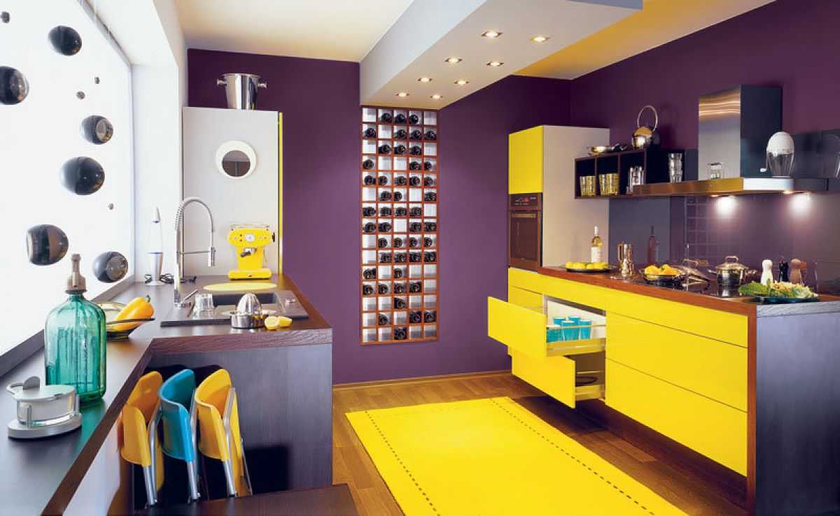 Желтый свет может немного исказить цвет фиолетовой кухни