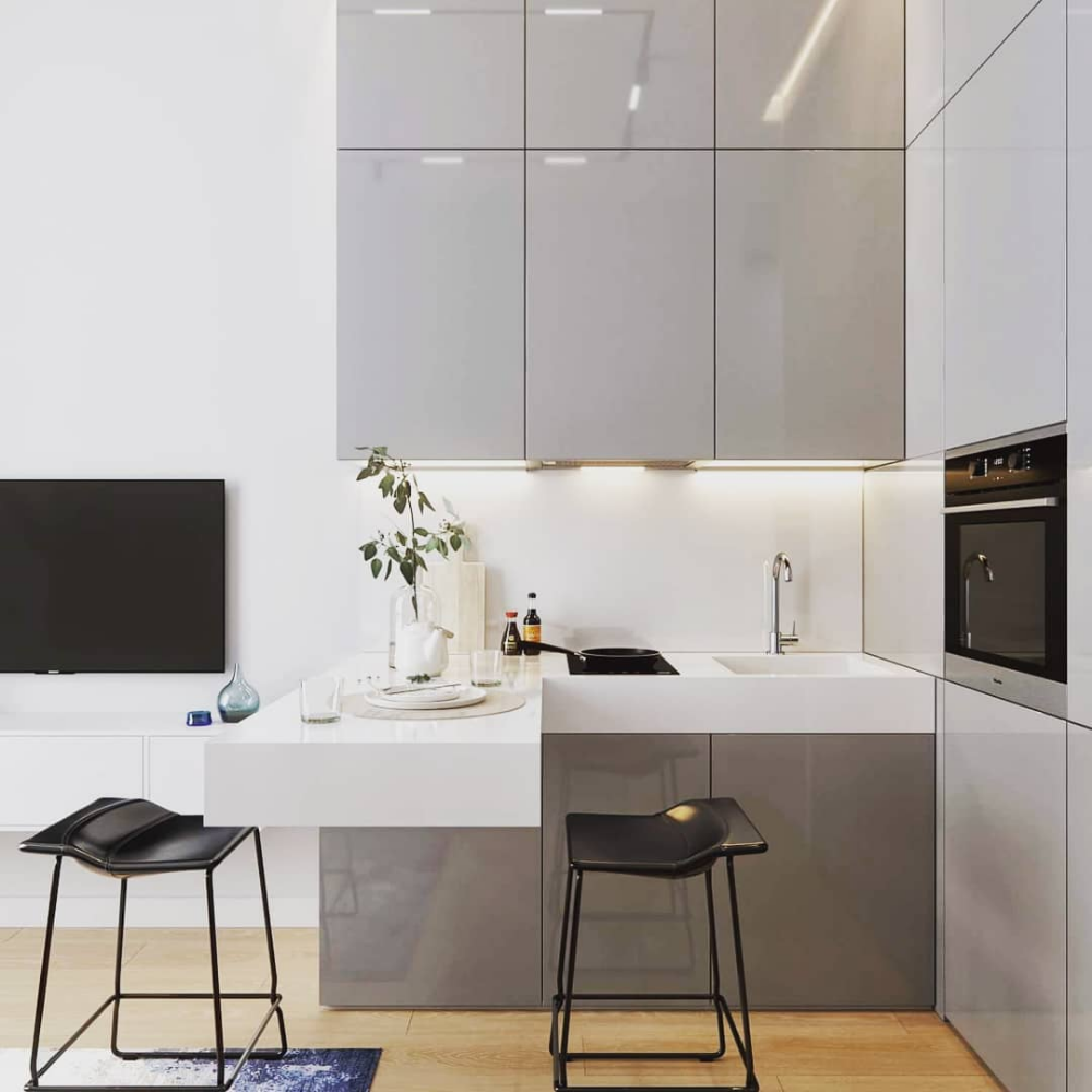 Если нужно обустроить маленькую кухню и одновременно сделать ее визуально просторнее, лучше выбрать светло-серый мебельный гарнитур с глянцевыми фасадами, а стены и потолок сделать белыми.