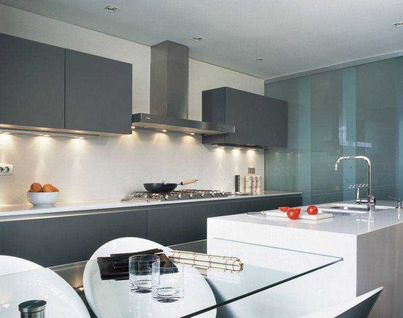 Белая кухня с серой столешницей или наоборот? А может стоит добавить третий цвет? Поскольку вариантов оформления фартука значительно больше, выбирать стоит именно со столешницы.